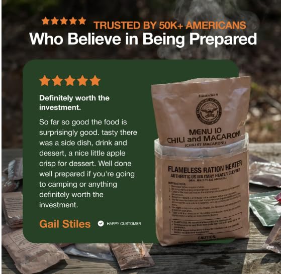 Eat Like a Soldier – Anytime, Anywhere Prepare for the unexpected or fuel your next adventure with our Military-Grade MRE (Meals Ready to Eat) packs. Designed for maximum convenience and nutrition, these self-contained meals are inspired by U.S. military standards—durable, portable, and ready to eat with no refrigeration or cooking required. Perfect for camping, hiking, emergency preparedness, or travel, each MRE provides around 1,250 calories of satisfying, energy-packed food. Just open and enjoy—no extra ingredients or prep steps needed. Why Choose Our MREs? ✅ Long Shelf Life: Store at room temperature for 5+ years; each has an inspection date 3 years post-pack date. ✅ Flavor Variety: Enjoy globally inspired meals—Italian, Mexican, Asian, vegetarian, and traditional favorites. ✅ Complete Meal Kits: Includes entrées, sides, snacks, desserts, and drinks like coffee, protein shakes, electrolyte powders, and more. ✅ Essential Extras: Accessory pack includes utensils, napkins, matches, seasonings, and even toilet paper. ✅ Military-Style Labeling: Understand Julian and standard date formats for clear storage tracking. Meal Highlights (Menus 1–24): Menu 1: Chili with Beans + Crackers, Cornbread, Grape Drink Menu 5: Chicken Chunks + Teriyaki Strips, Tortillas, Fruit Punch Menu 10: Chili Mac + Jalapeño Cheese, Crackers, Orange Drink Menu 16: Chicken Burrito Bowl + Tortillas, Pastry, Hot Sauce Menu 23: Pepperoni Pizza Slice + Applesauce, Oatmeal Cookie, Chocolate Drink …and many more satisfying options! Case Breakdown: Case A: Menus 1–12 Case B: Menus 13–24 Whether you're a prepper building your survival stockpile or an outdoor enthusiast seeking reliable meals on-the-go, our MREs deliver nutrition, variety, and peace of mind—with flavor and convenience in every bite.