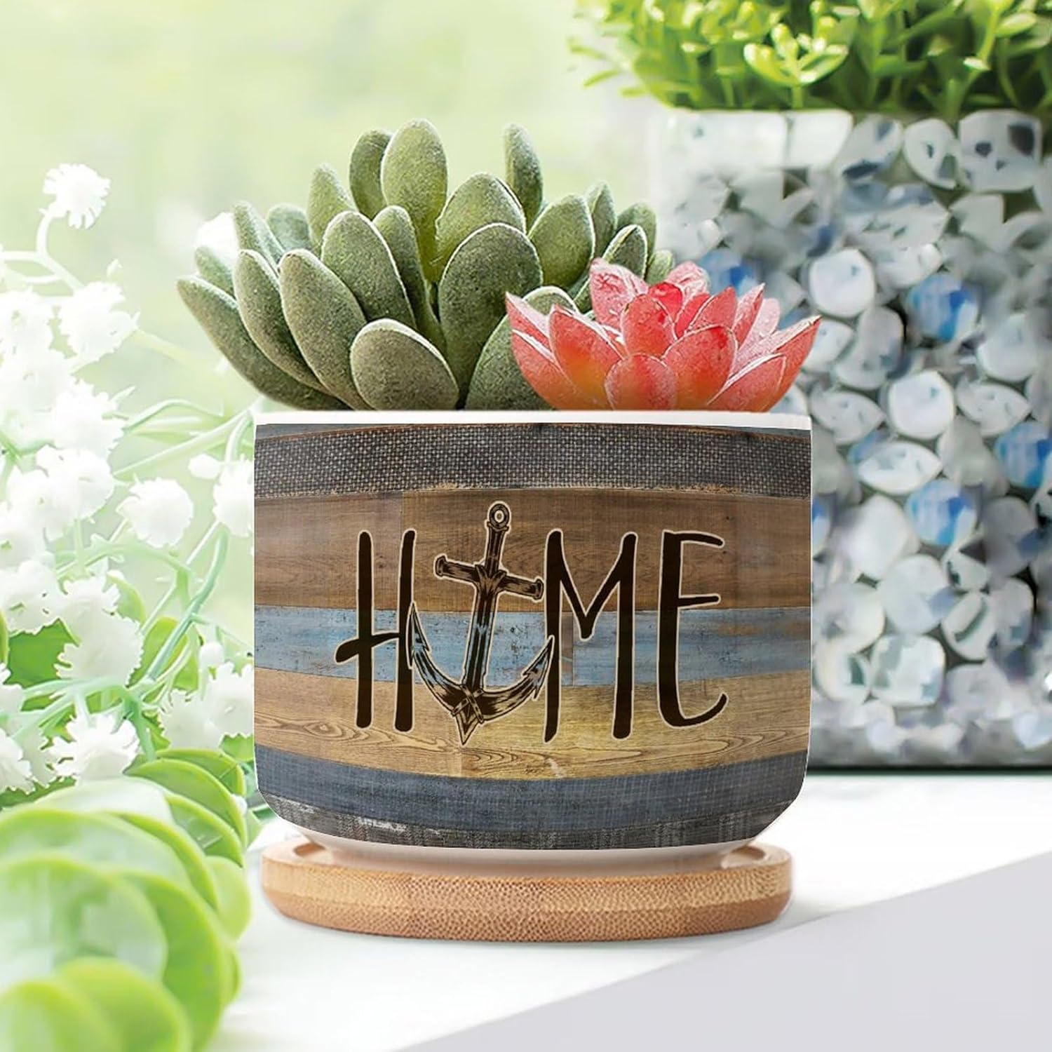 Size: 6cm×5.5cm (2.4×2.2inch) Material: Ceramic flower pots. Double Sided Printed. Product Contains: Ceramic planter + bamboo trays Suitable: Succulents, cactus, cacti, other small flowers and green plants. Best Mother's Day Gift for mom. Perfect gift for women. Suitable for both indoor and outdoor use.