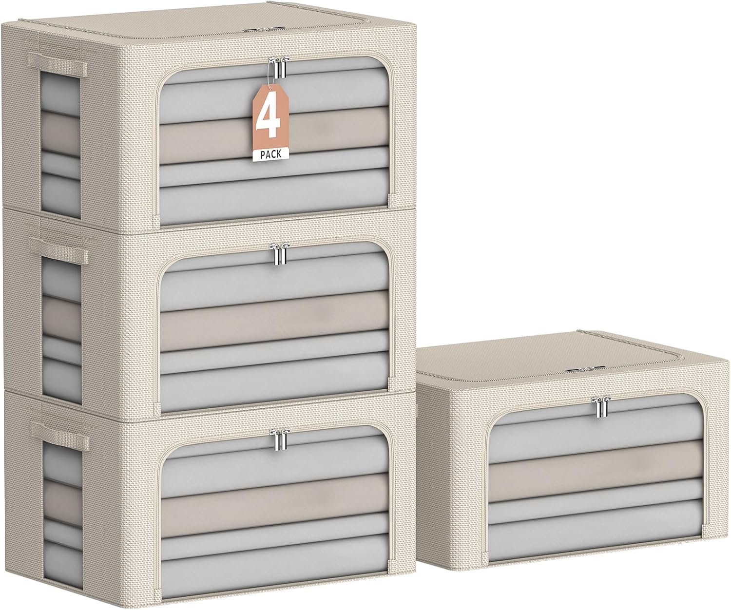 4 Pack Clothes Storage Bins - Oxford Fabric Metal Frame Storage Box - Foldable Stackable Container Organizer Set with Clear Window & Carry Handles & Zippers (Grey, 19.7"x15.7"x8")