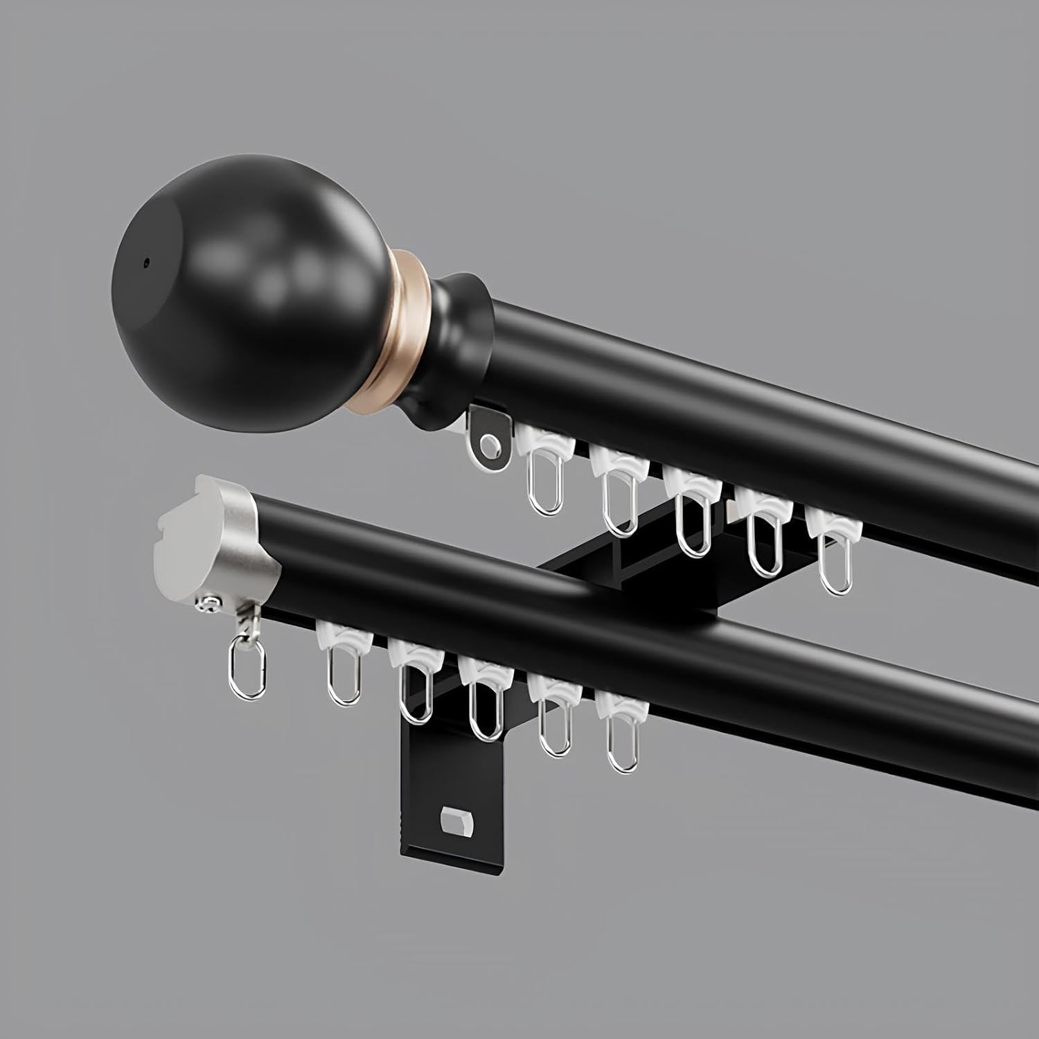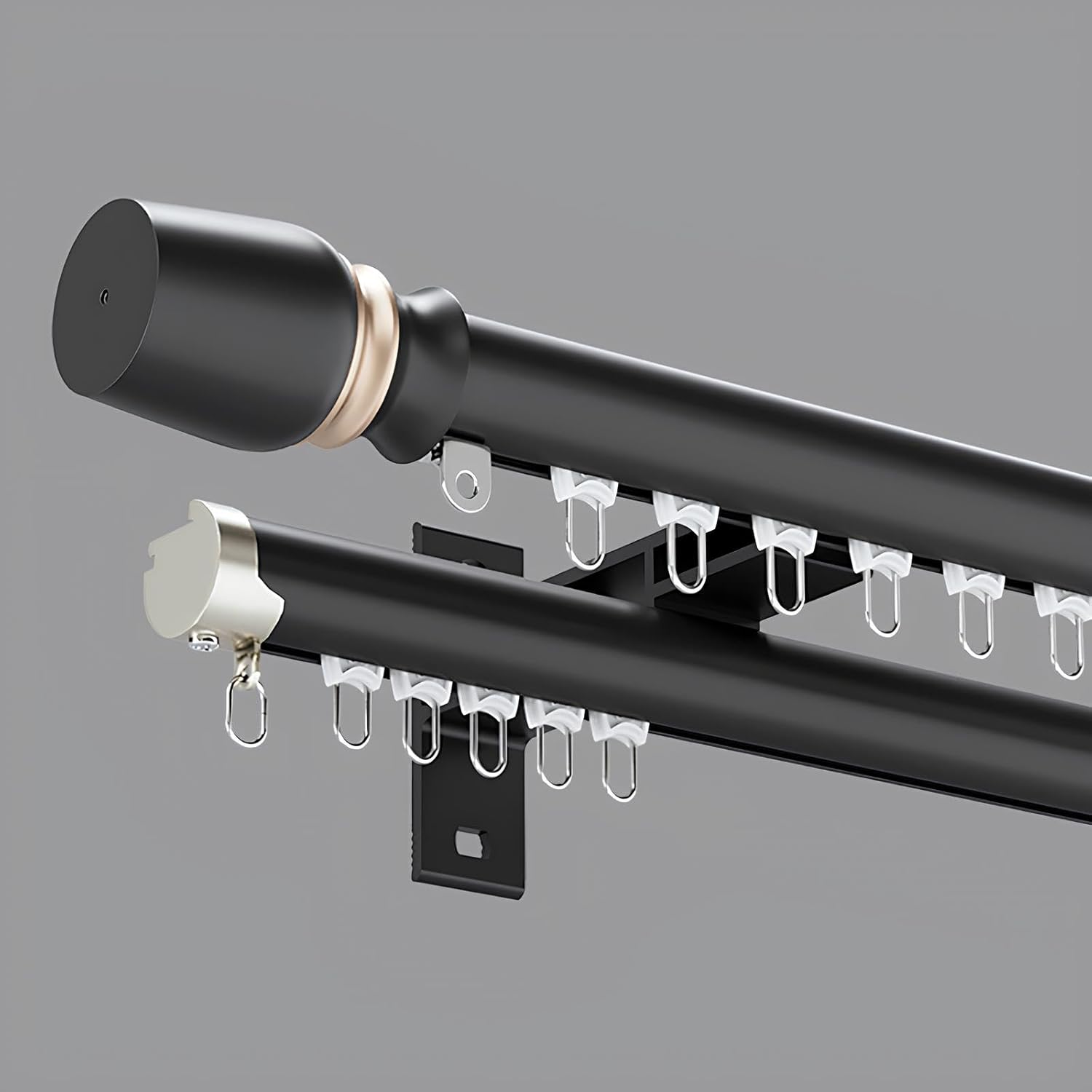 This wall-mounted curtain track set boasts a simple, modern design and sturdy construction. Made from premium aluminum alloy, it boasts a smooth, Wear-resistant surface and is suitable for a variety of homes and commercial spaces. Whether used for curtain installation or room dividers, it combines practicality and aesthetics.📏 Product SpecificationsColors: Black / Gray / WhiteMaterial: High-strength aluminum alloyMount: Wall-mountedSuitable for: Living rooms, bedrooms, bathrooms, RVs, bay windows, and open-plan space dividers💡 Product AdvantagesStable and Load-Bearing: The sturdy aluminum construction provides strong support, even for heavy curtains.Smooth and Quiet: The high-quality pulley design provides low friction and quiet operate, allowing for effortless opening and closing.Smooth Connection: The built-in splicer ensures smooth track connection without deflection or jamming.Quick Installation: Dual brackets per meter ensure a secure and stable installation.Versatile Application: Suitable not only for window decorations, but also for room dividers or privacy curtains.🏠 Suitable for:Home bedrooms, living room bay windows, bathrooms, RVs, offices, hotels, or other spaces requiring space separation.📦 Package Includes:2 wall mount brackets per meter8 pulleys per meterA - 2 decorative round head caps; 2 end caps (per set)B - 2 decorative heads; 2 end caps (per set)Tracks longer than 1.50 meters require additional reinforcement connectors⚠ NotesBefore installation, please measure the width of your window or space to determine the appropriate track length.Tracks longer than 1.50 meters are spliced and should be reinforced using the included connectors.During installation, ensure the wall's load-bearing capacity is verified and secure with matching expansion screws.