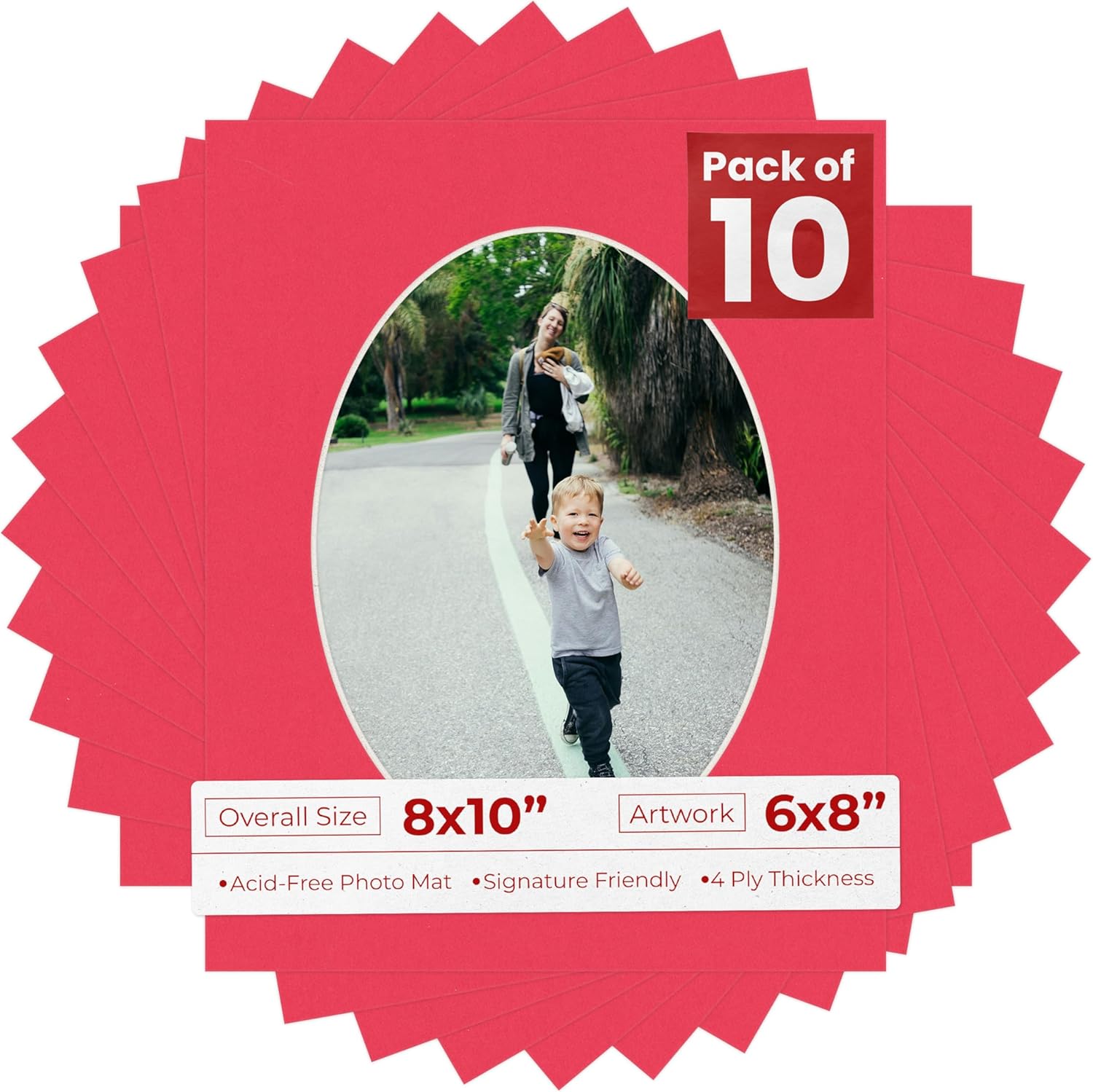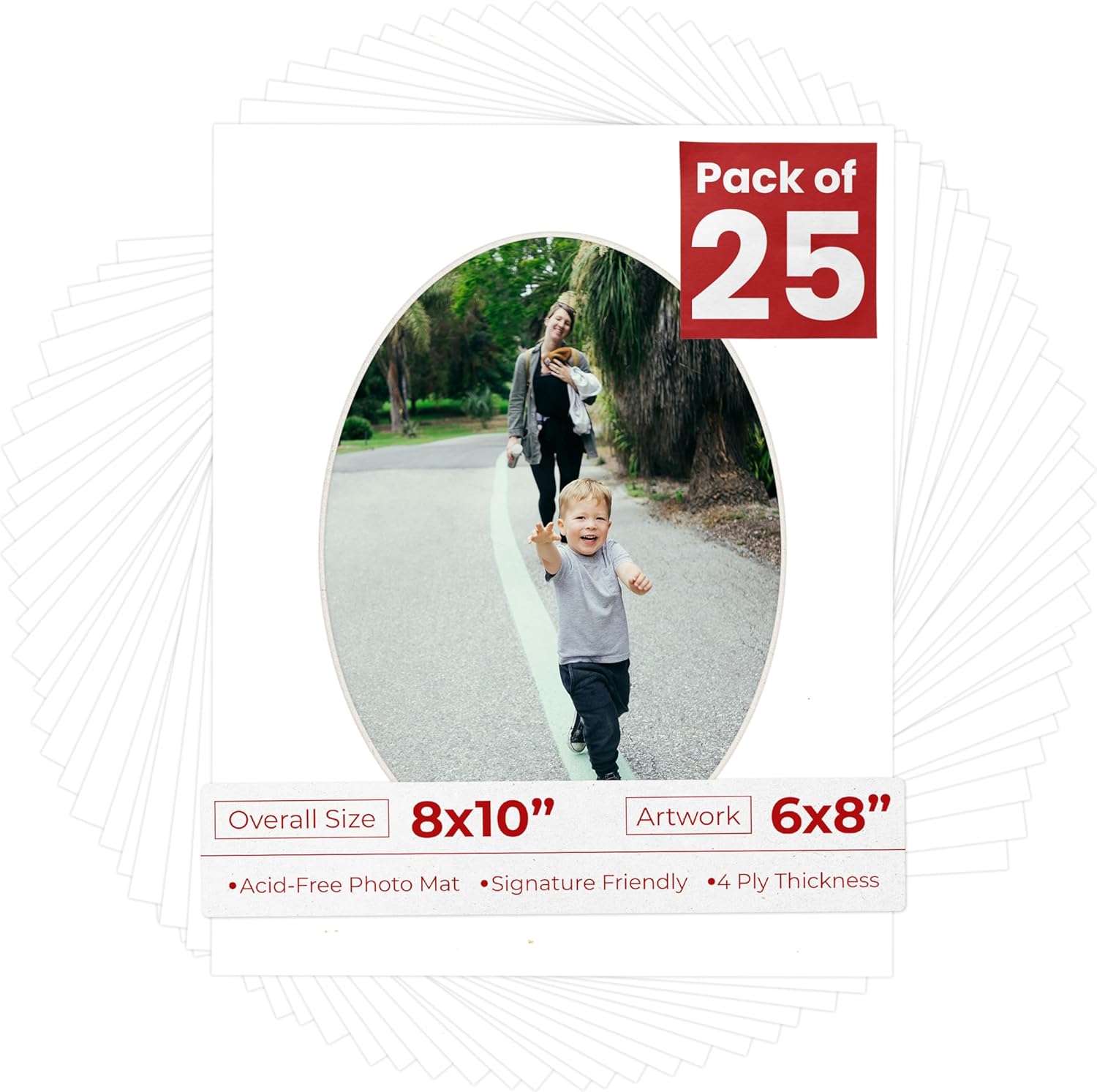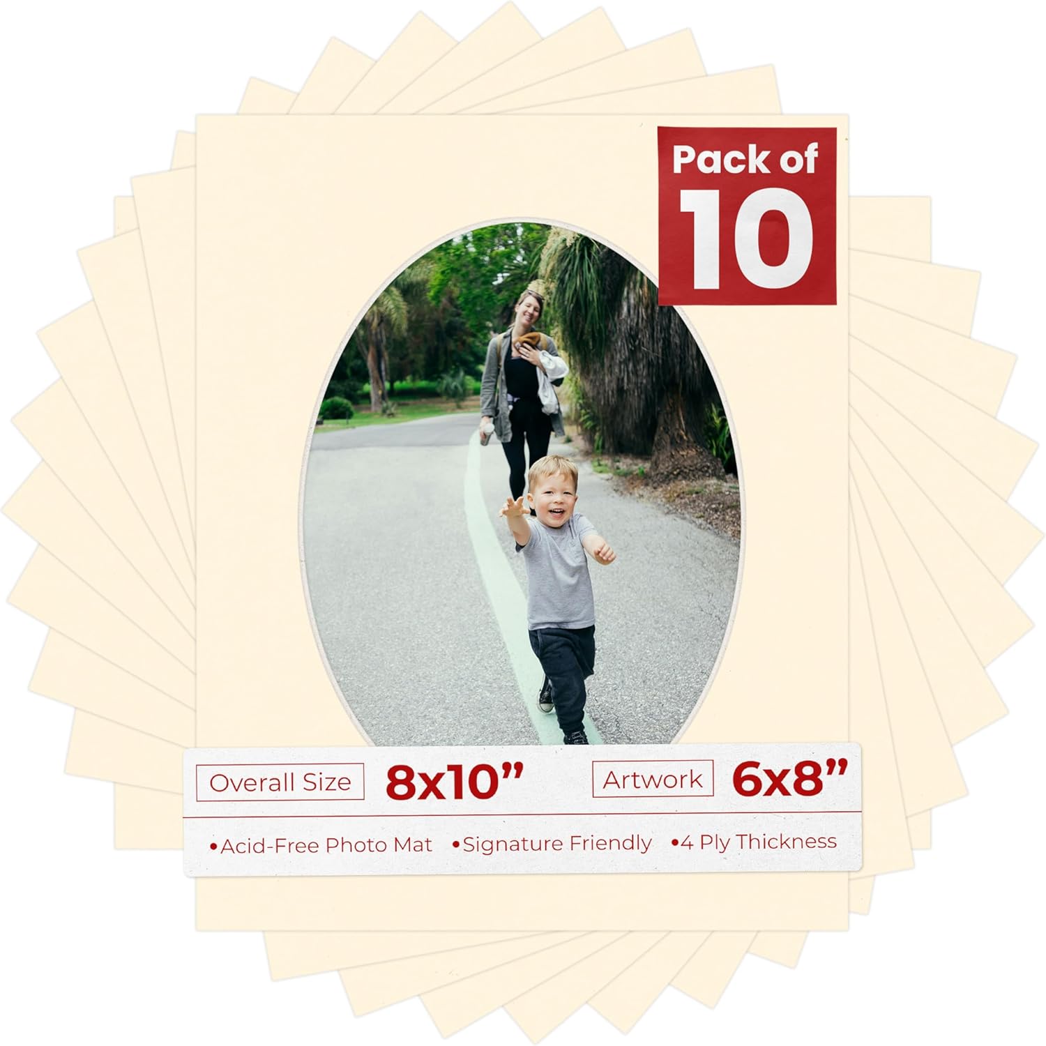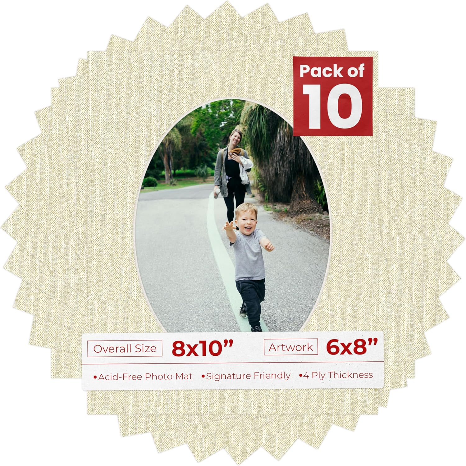 OVERALL SIZE (Made to fit a Frame Size Measuring) 8x10 Inches | Bevel Cut Oval Opening Size of 5.5x7.5 inches | For a Photo Measuring 6x8 Inches. THIS IS FOR 10 matboards. White linen canvas PHOTO MAT with a oval bevel cut opening. A great way to change up the look of an existing frame with a new accent mat board. This matte also works great as a replacement for damaged, dirty, or faded matting in your old frames. PREMIUM QUALITY: Our precut photo matboards are acid free & precision cut with a 45 degree bevel by machine for perfect corners and NO over-cuts every single time! All of our precut matboards are MANUFACTURED BY POSTER PALOOZA IN THE USA.