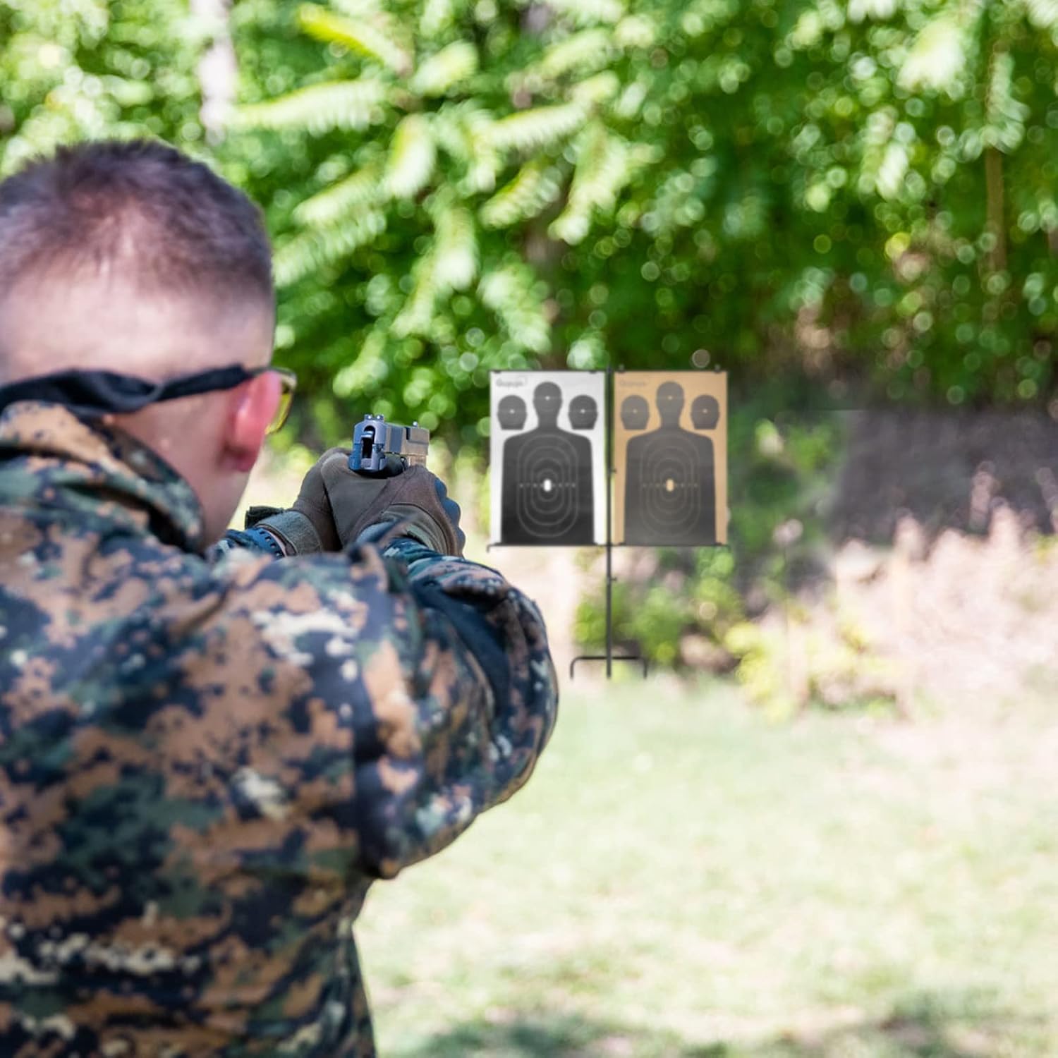 Package included: The bb gun targets and paper target stand. The small bb target for shooting indoor with 10 pcs shooting target papers, replaceable and reusable. Larger adjustable range: Adjustable top & bottom horizontal bars fit the target range of 14.56 to 25.59 inches. Holds targets up to 17” x 25” in size. Airsoft Accessories are perfect for outdoor & indoor. Suitable for firearms: rifle, air gun, pistol, shotguns, bb gun and so on.