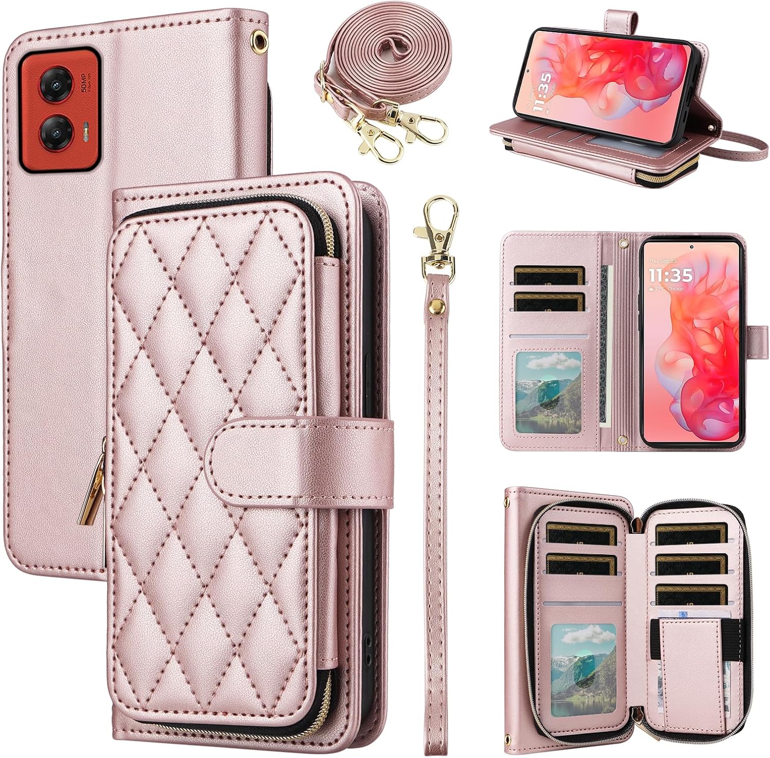 Argyle Wallet Case for Motorola Edge 5G 2024 with Wrist Strap Shoulder Strap, Card Slots Zipper Purse Luxury PU Leather Stand Checkered Cell Phone Cover for Moto Edge2024 Women Girls Rose Gold