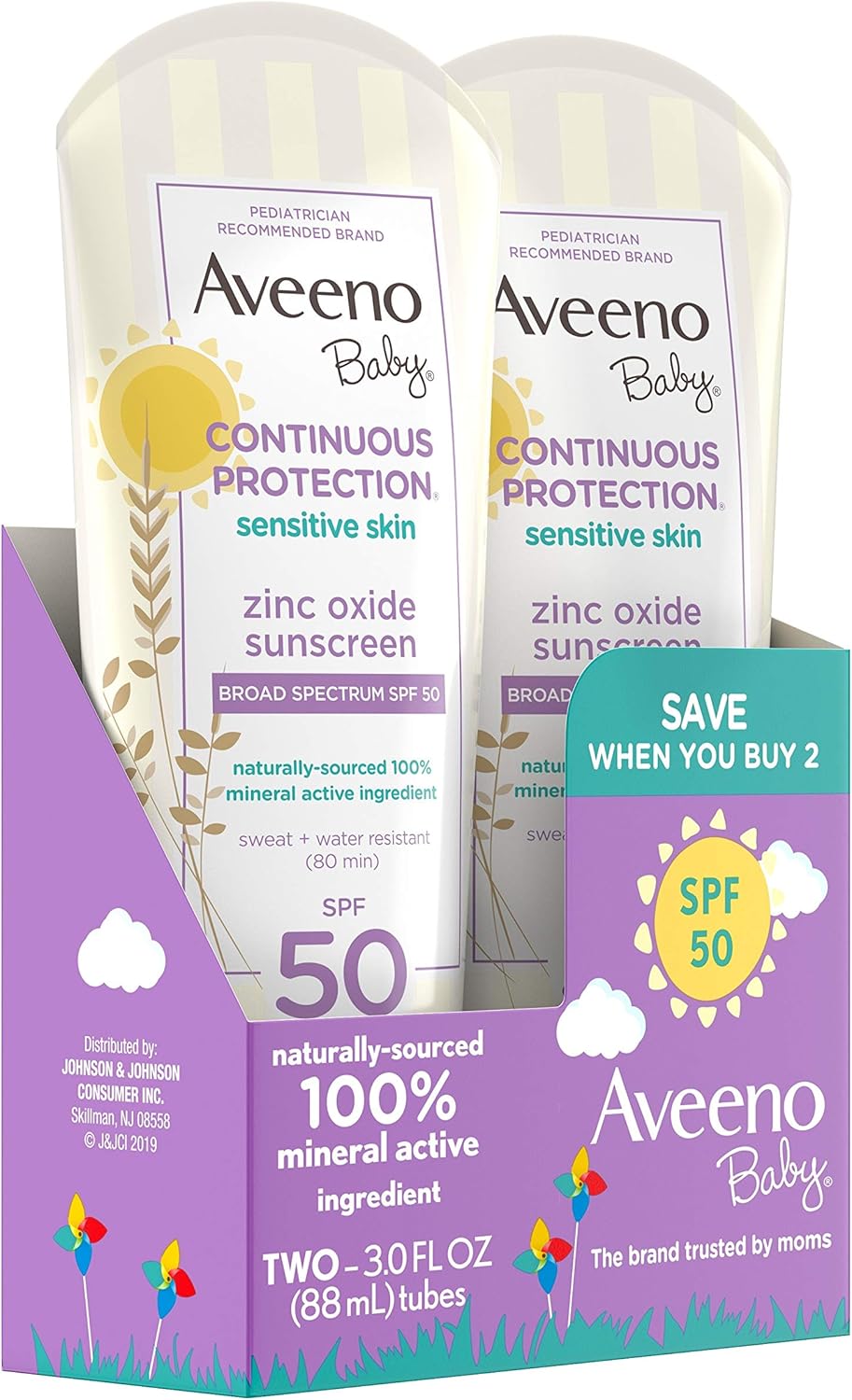 An effective baby mineral sunscreen that's as mild as water to skin. Aveeno Baby Continuous Protection Sensitive Skin Sunscreen Lotion with Broad Spectrum SPF 50 contains skin-soothing oat and naturally-sourced 100% zinc oxide active ingredient. The mineral sunscreen provides superior broad spectrum protection from UVA/UVB rays and is both sweat- and water-resistant for 80 minutes. From the pediatrician-recommended brand, this hypoallergenic baby sunscreen lotion is designed for baby's sensitive skin and applies easily to lock in moisture without stinging. Its tear-free formula is non-greasy and is free of parabens, phthalates and fragrance. This baby sunscreen has been awarded the National Eczema Association Seal of Acceptance and is recommended by the Skin Cancer Foundation as an effective broad spectrum sunscreen. It comes in a convenient TSA travel-friendly travel size and is suitable for use on the face and body.