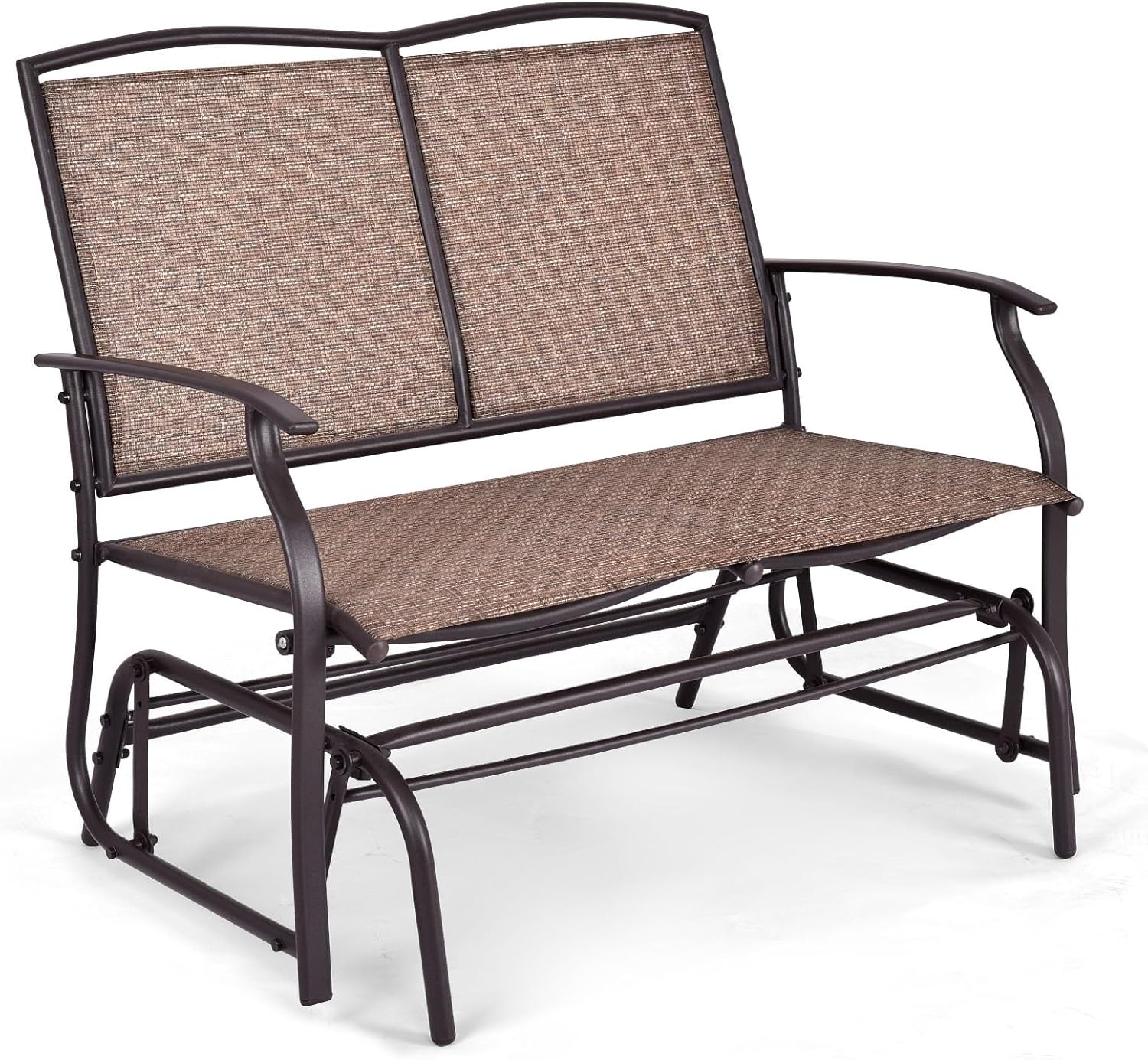 Description:Our patio glider bench is an exceptional choice for both relaxation and free rocking experience.Made of heavy-duty metal frame, this 2-person glider ensures outstanding durability and stability for you. The spacious sitting area, coupled with the ergonomic design, allows you to sit comfortably alongside your best friend or family member. What's more, the breathable seat fabric facilitates excellent air ventilation and dries quickly. You can enjoy the luxury of relaxing, sunbathing, chatting or even taking a nap in different locations such as your garden, backyard, deck or poolside.Features:Smooth and quiet gliding for cozy relaxing time400 lbs weight capacity for 2 adults' safe swingingErgonomic seat with comfortable backrest and curved armrestsSturdy metal frame for higher security and long-term useBreathable and easy-to-dry seat fabric suitable for hot daysAnti-slip foot pads for better protectingWide application for poolside, courtyard, balcony, garden, front porchClear and detailed instruction for simple assemblySpecification:Color: Black/Grey/BrownMaterials: Metal, FabricOverall Dimension: 41.5'' x 28'' x 37''(L x W x H)Seat Dimension: 38'' x 21'' (L x W)Seat Height: 16.5''Weight Capacity: 400 lbsNet Weight: 23 lbsPackage Includes:1 x Patio Glider1 x Instruction