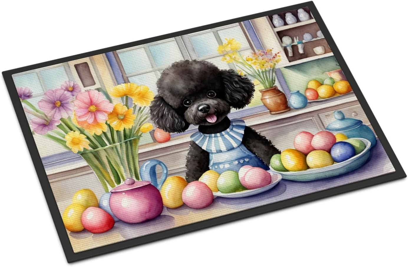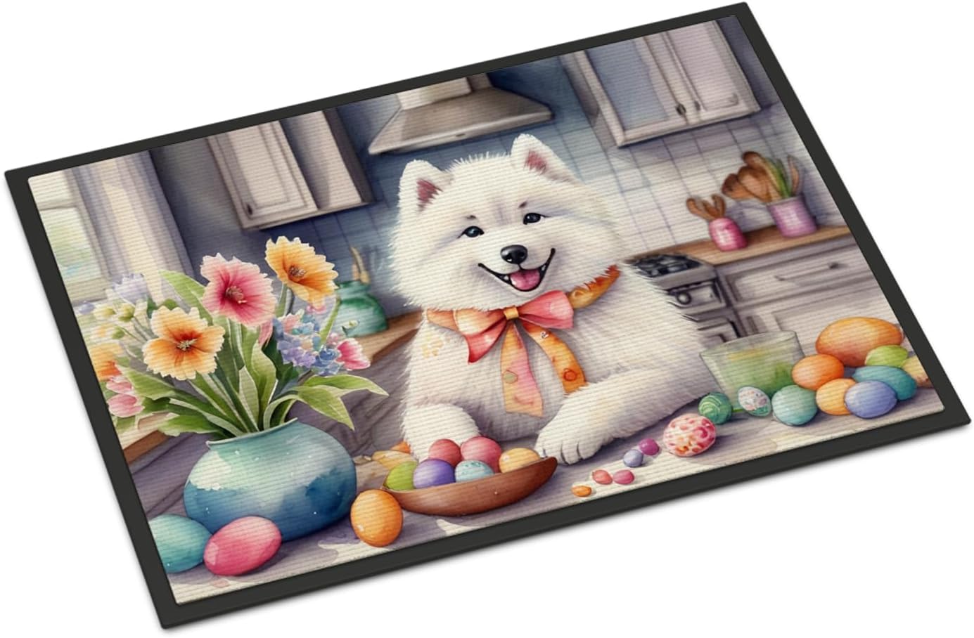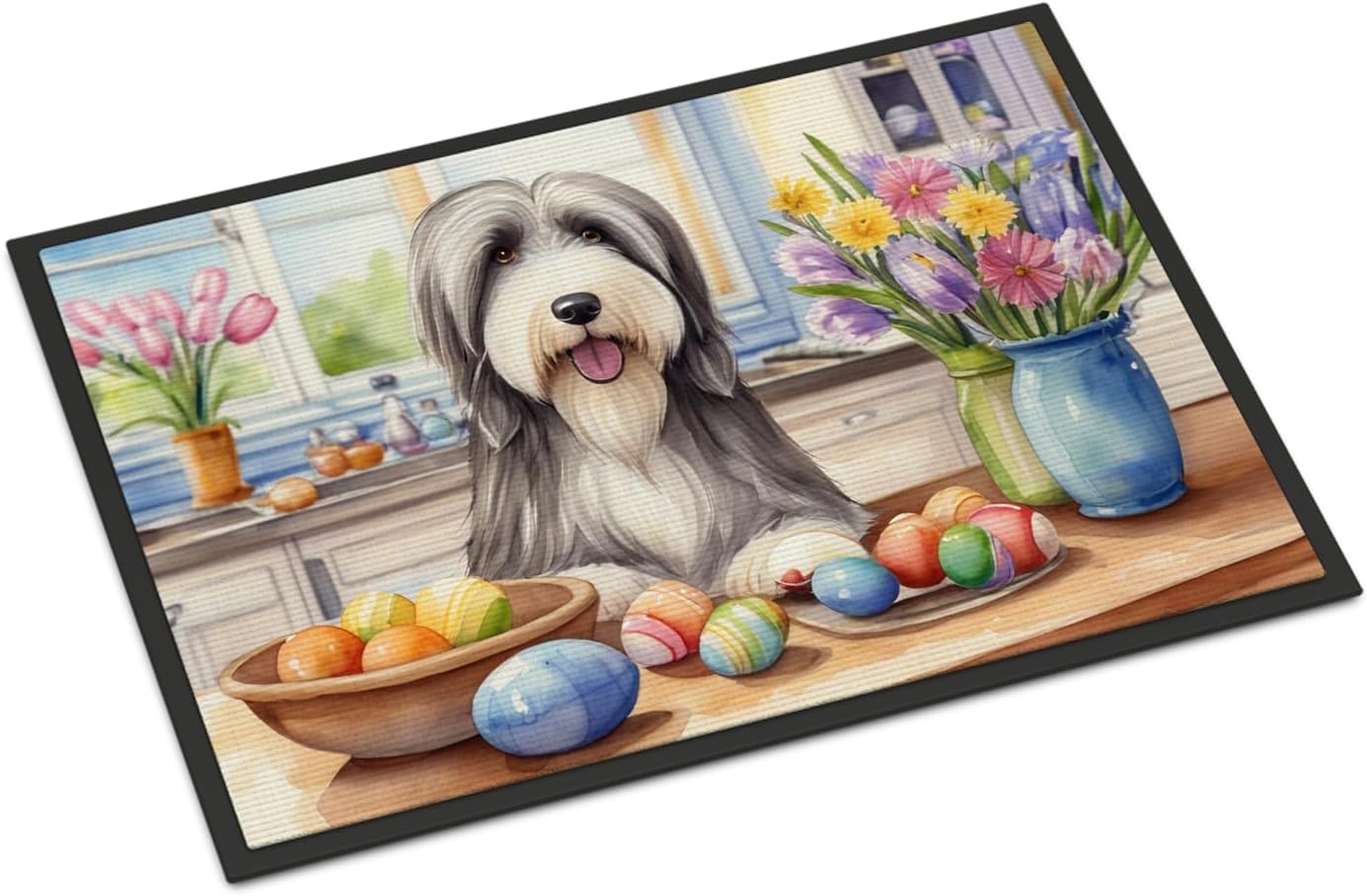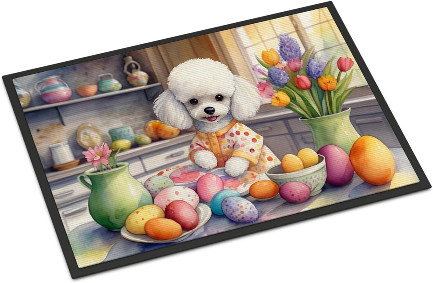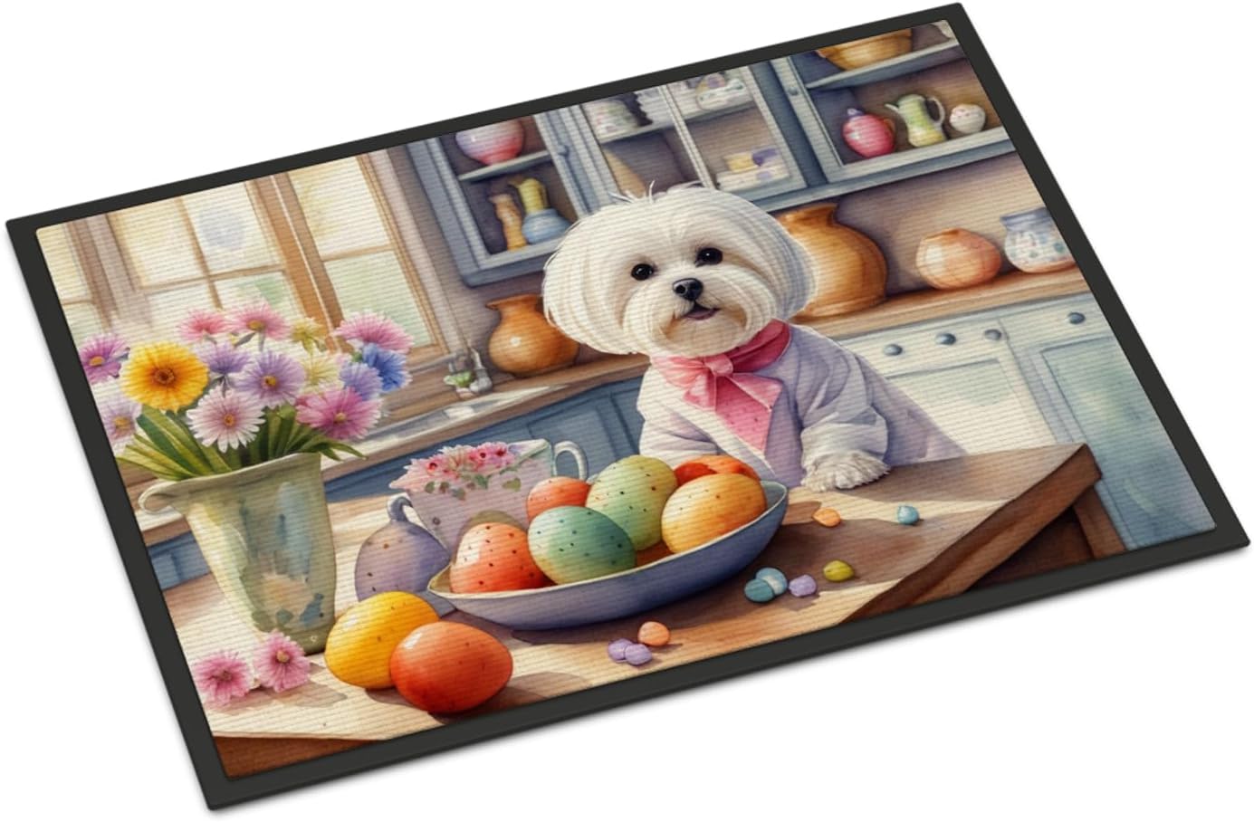 Doormat featuring breed specific Bichon Frise artwork. Celebrate Easter with this Easter Doormat. Welcome your guests in style with our Artwork Door Mat, designed to withstand almost any weather condition. This mat, measuring approximately 24 by 36 inches, is held together by durable black binding tape. Its top layer, composed of polyester felt, is dyed with the eye-catching image you see on the mat. A few layers below provide the mat with stability, while its rubber bottom is stamped to help prevent slipping and ensures safety. Our mat works wonderfully as both an indoor or outdoor door mat. For cleaning, simply hose it off with water or use a power washer - no need for any cleaner that produces suds. Avoid scrubbing with a brush, instead, opt for the vacuum on floor setting. Designed manufactured and printed in the USA, this mat is a perfect addition to your porch, outdoor kitchen, entryway, or any indoor space. Its unique design makes it a charming decorative rug that greets your guests and adds a stylish touch to your home decor.