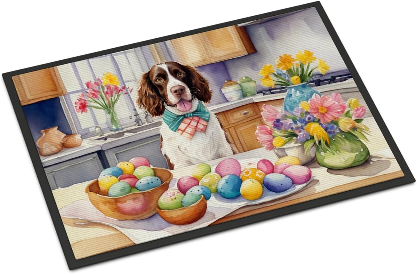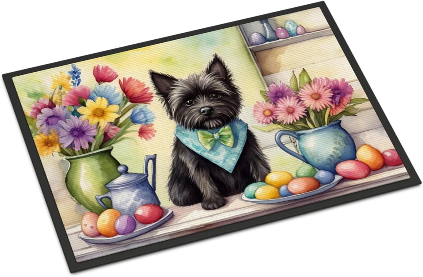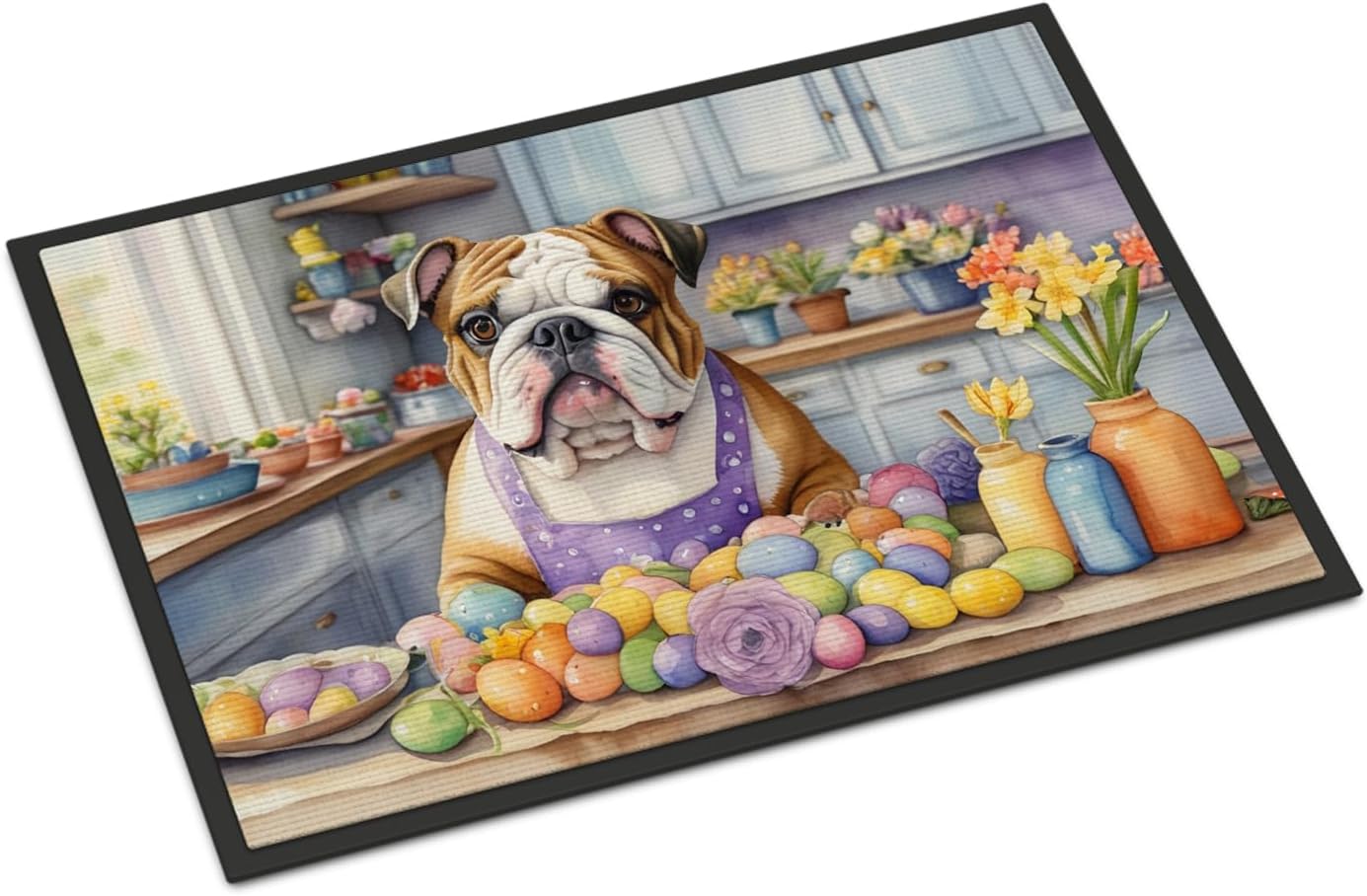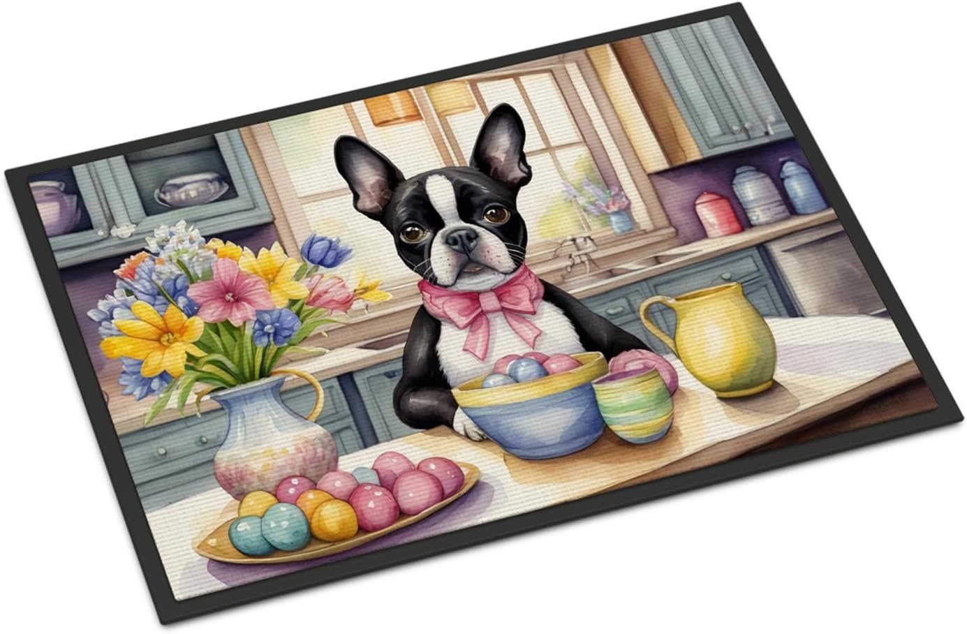 Doormat featuring breed specific Bichon Frise artwork. Celebrate Easter with this Easter Doormat. Welcome your guests in style with our Artwork Door Mat, designed to withstand almost any weather condition. This mat, measuring approximately 24 by 36 inches, is held together by durable black binding tape. Its top layer, composed of polyester felt, is dyed with the eye-catching image you see on the mat. A few layers below provide the mat with stability, while its rubber bottom is stamped to help prevent slipping and ensures safety. Our mat works wonderfully as both an indoor or outdoor door mat. For cleaning, simply hose it off with water or use a power washer - no need for any cleaner that produces suds. Avoid scrubbing with a brush, instead, opt for the vacuum on floor setting. Designed manufactured and printed in the USA, this mat is a perfect addition to your porch, outdoor kitchen, entryway, or any indoor space. Its unique design makes it a charming decorative rug that greets your guests and adds a stylish touch to your home decor.