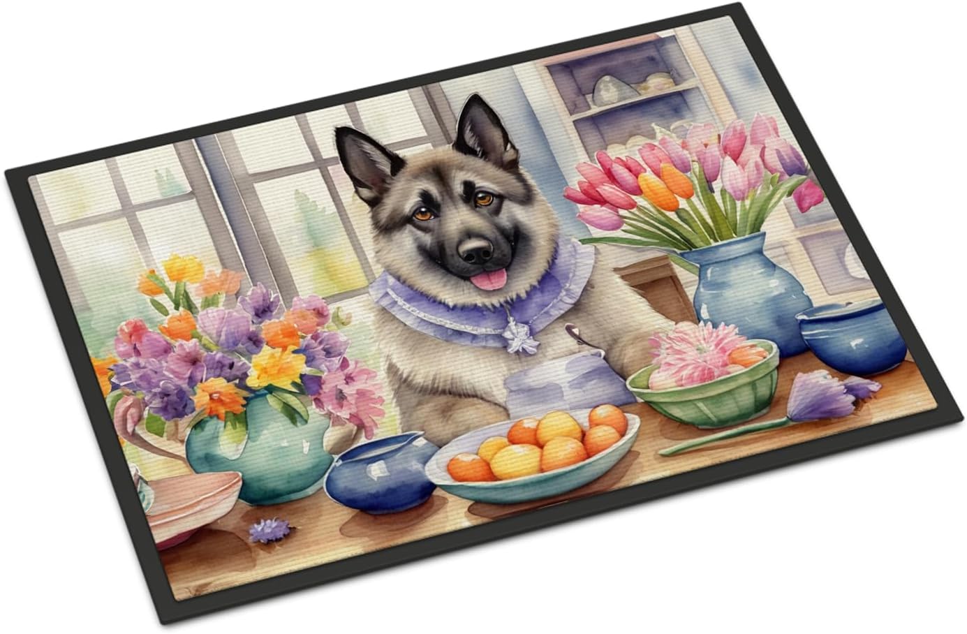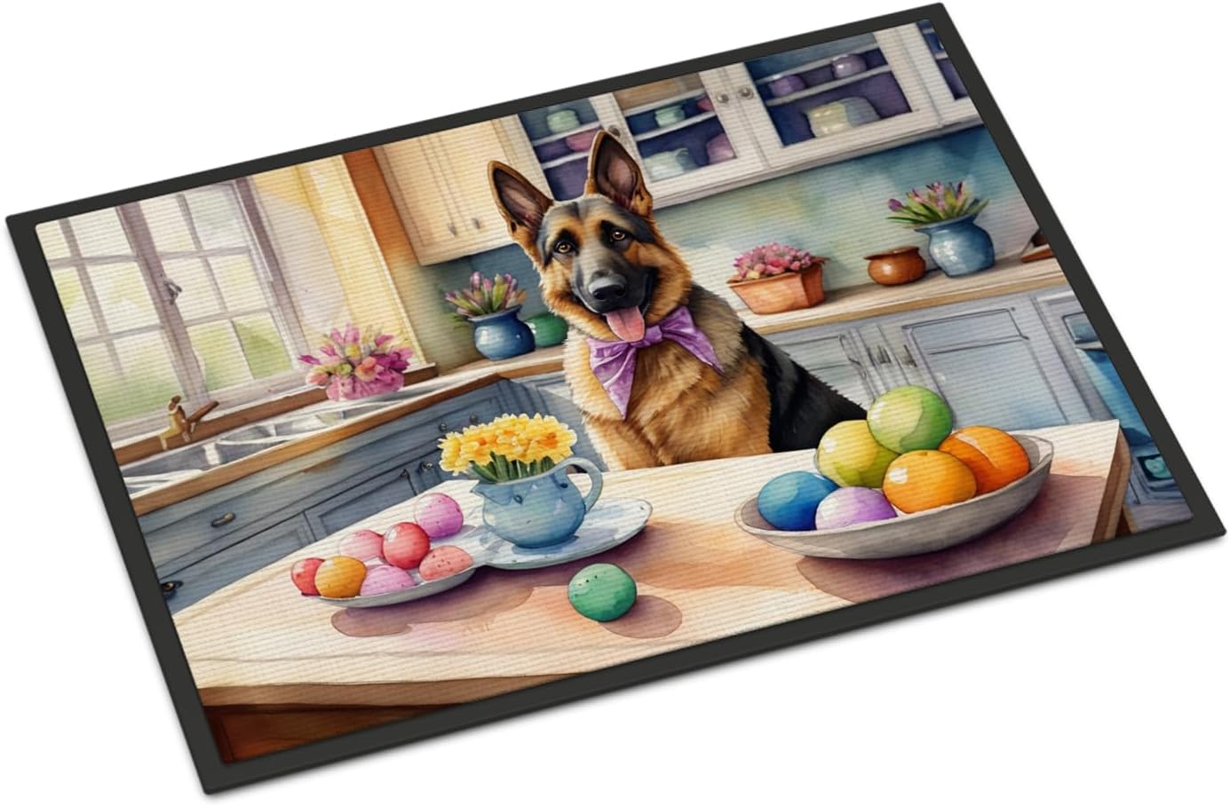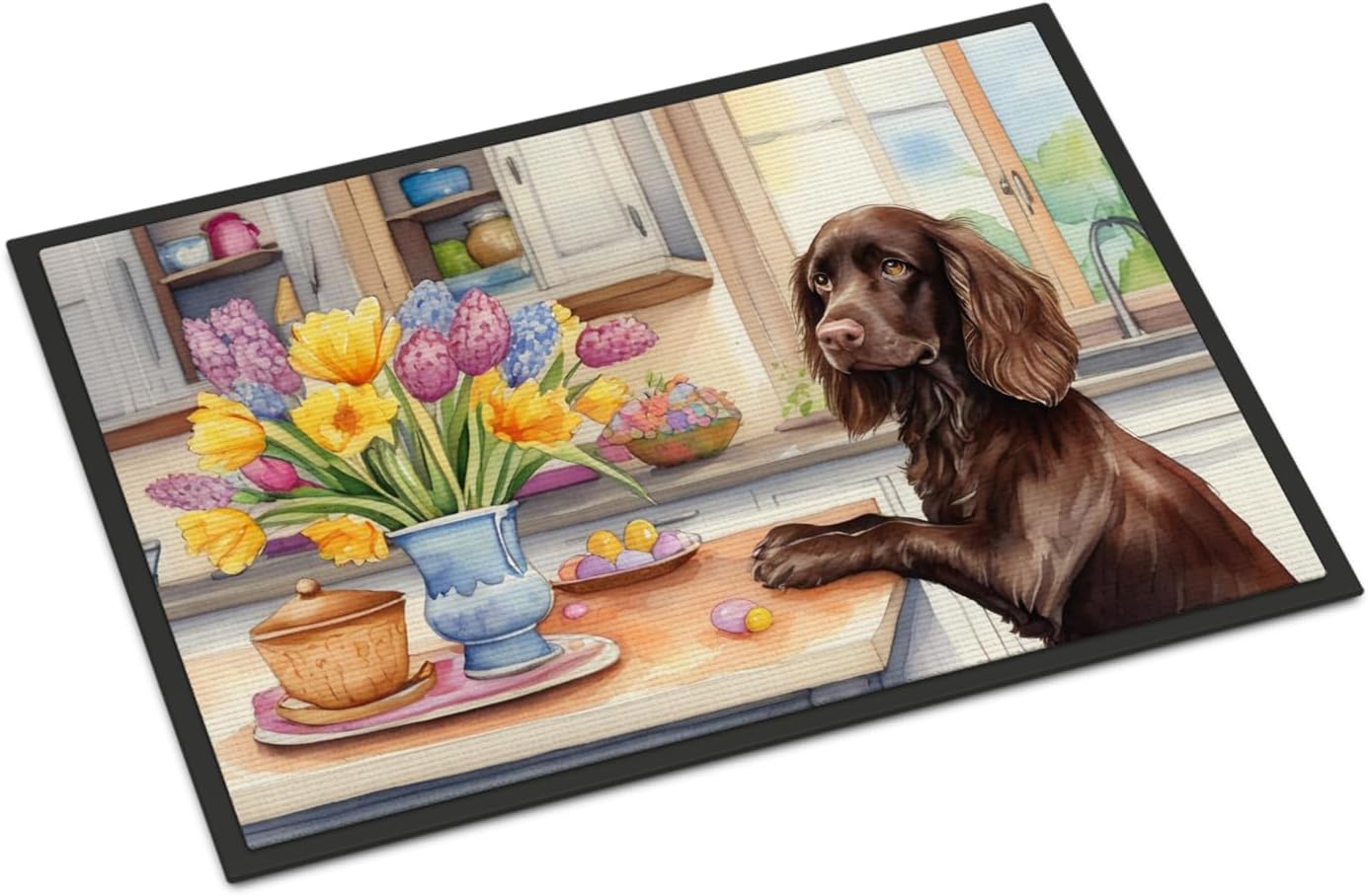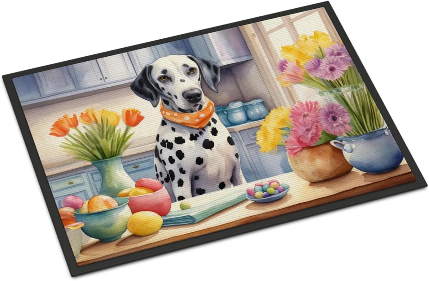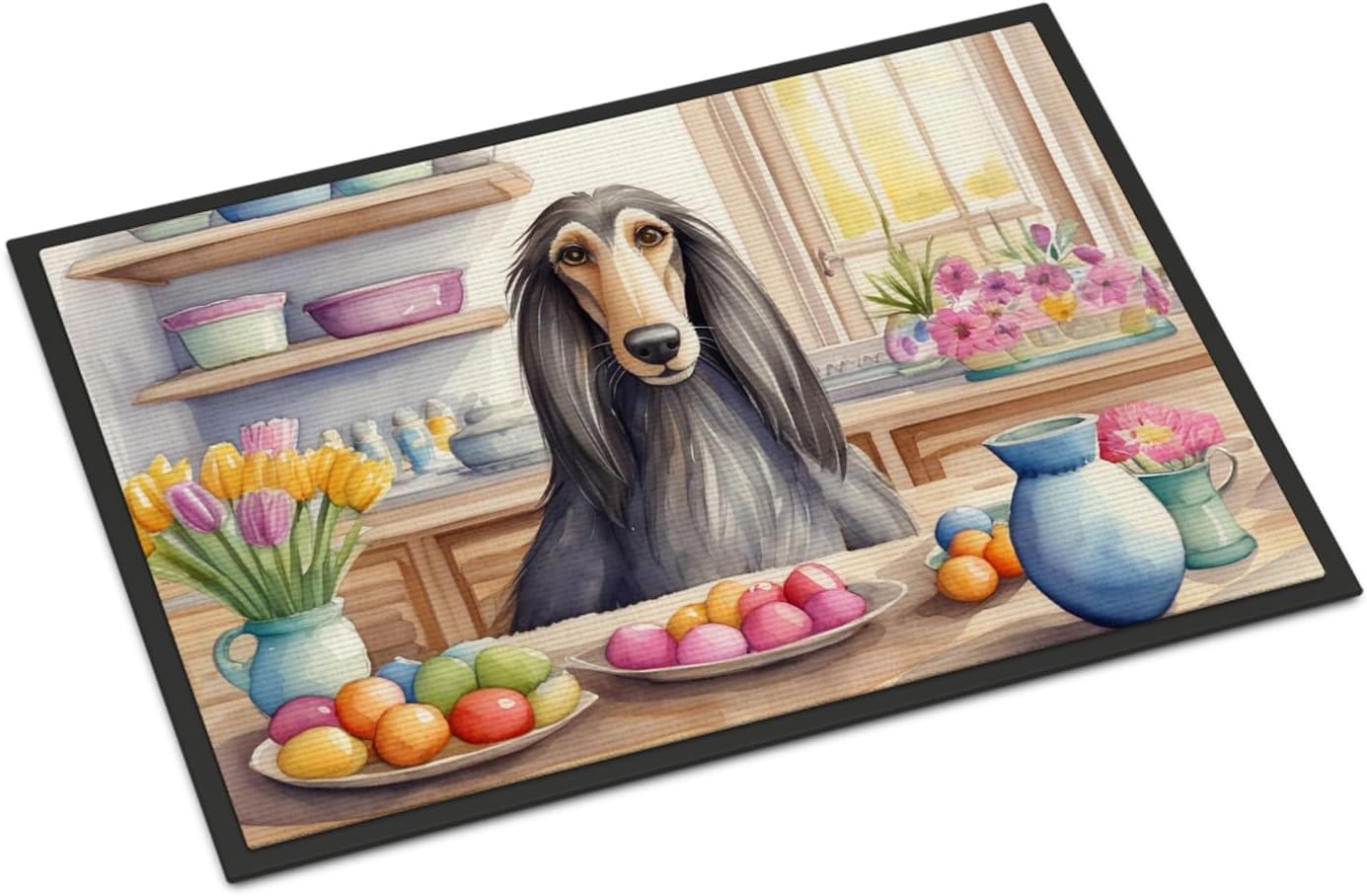 Doormat featuring breed specific Bichon Frise artwork. Celebrate Easter with this Easter Doormat. Welcome your guests in style with our Artwork Door Mat, designed to withstand almost any weather condition. This mat, measuring approximately 24 by 36 inches, is held together by durable black binding tape. Its top layer, composed of polyester felt, is dyed with the eye-catching image you see on the mat. A few layers below provide the mat with stability, while its rubber bottom is stamped to help prevent slipping and ensures safety. Our mat works wonderfully as both an indoor or outdoor door mat. For cleaning, simply hose it off with water or use a power washer - no need for any cleaner that produces suds. Avoid scrubbing with a brush, instead, opt for the vacuum on floor setting. Designed manufactured and printed in the USA, this mat is a perfect addition to your porch, outdoor kitchen, entryway, or any indoor space. Its unique design makes it a charming decorative rug that greets your guests and adds a stylish touch to your home decor.
