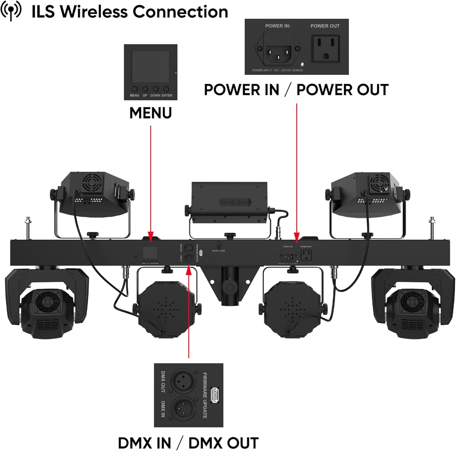 Chauvet DJ GIG BAR MOVE+ ILS is a 5-in-1 lighting system that includes moving heads, derbies, washes, a laser and strobe effect pre-mounted on a single bar. Integrated Lighting System (ILS) is a complete lighting ecosystem technology that provides an advanced, coordinated light show across multiple fixture types