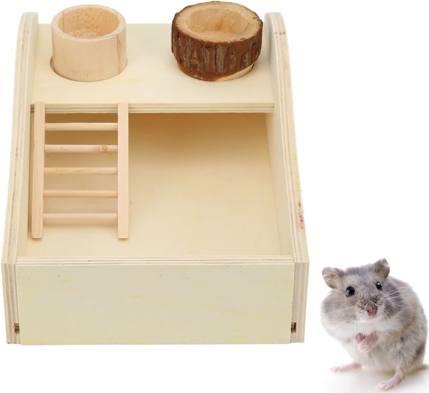 1. Hamster sand bath dust box made of wood. Durable and sturdy, which can withstand your little pet's teeth and claws. 2. Provide a environment for small pets to rest, play and , make pets happy and relieve stress. 3. The feeding platform is used as a hiding place, small animals can sleep after bathing, detachable and easy to install, with a climbing ladder, they can climb onto the platform to eat. 4. Provide a sand bath for hamsters, which likes to bathe in sand to get rid of excess oil and make their skin clean and shiny. 5. Put the bathing sand in the bathing sandbox and let the pets roll and clean, and they can enjoy the bathing moment. Spec: Item Type: Hamster Sand Bath Box Material: Composite Board, Log Purpose: Feeding and Playing with Pets PackageList: 1 x Base 2 x Curved Side Panels 2 x Rectangular Side Panels 1 x Food Bowl Platform 1 x Food Bowl 1 x Food Bowl with Bark 1 x 10 x Screw 1 x Climbing Ladder