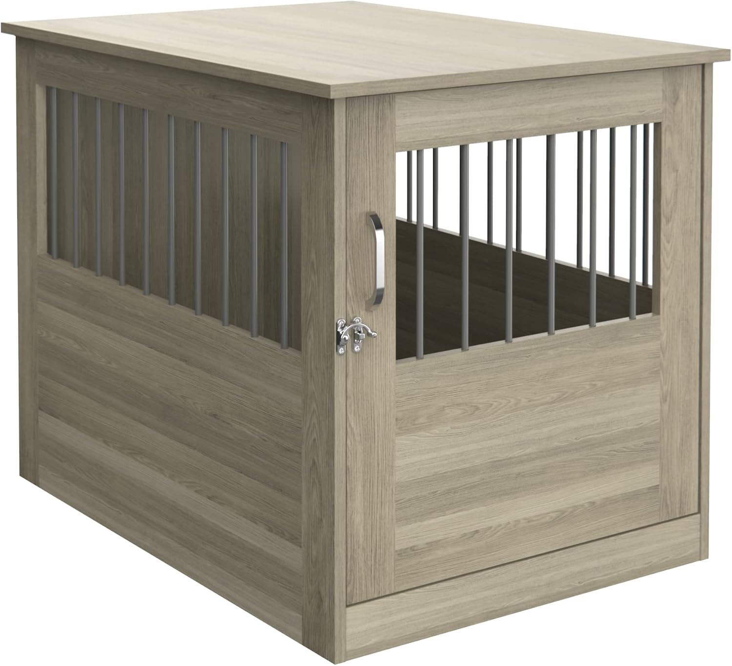 Designed as multi-functional and stylish, ClosetMaid’s Pet Crate End Tables are the perfect complement to your home décor. With a sturdy laminate wood design, this item doubles as an end table and pet crate. The top surface is just the right size to organize and display your personal items, while the interior space can contain your pet safely with a locking front door. Adding even more to the versatility are the vertical features in the window areas, providing ample ventilation for your pet but also adding a touch of upscale style. Ideal for both dogs or cats, this small pet crate is recommended for indoor use for pets 12 lbs. and under. The easy-to-assemble design allows you to quickly set up this Pet Crate with included hardware.