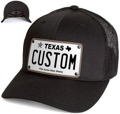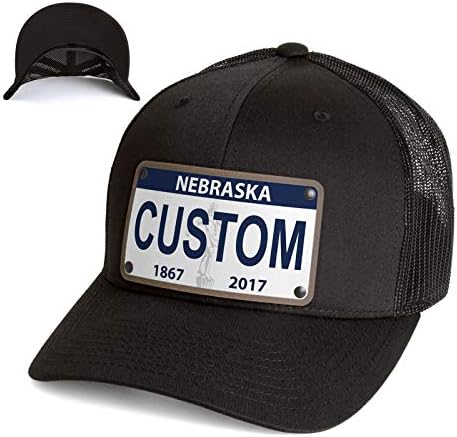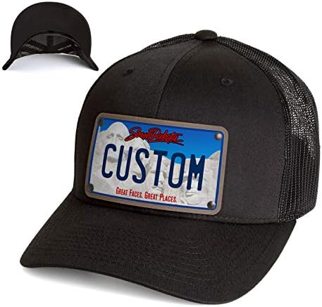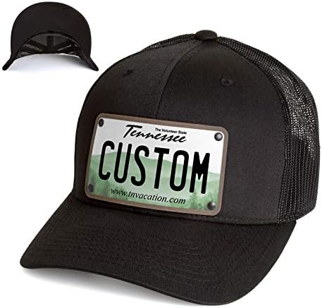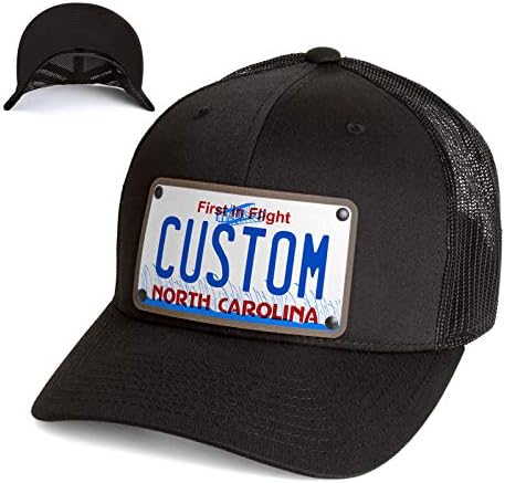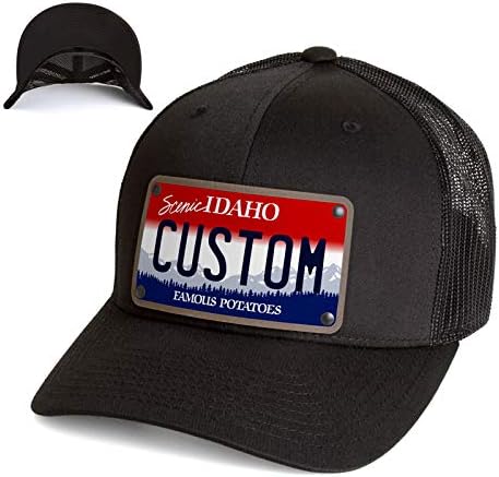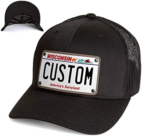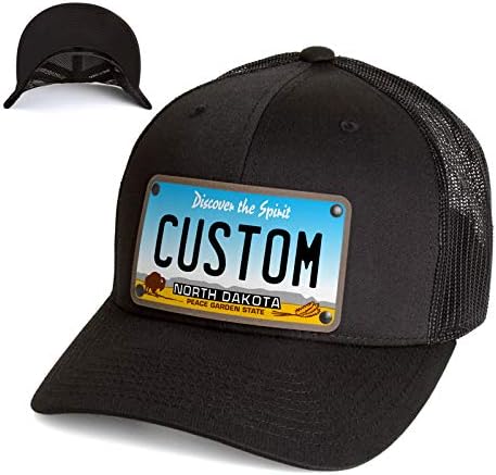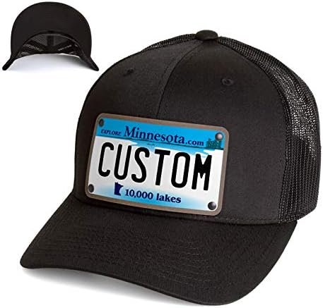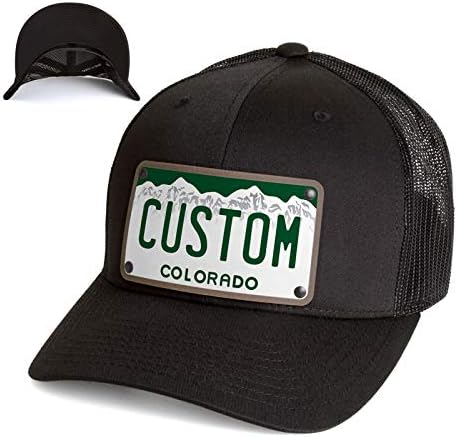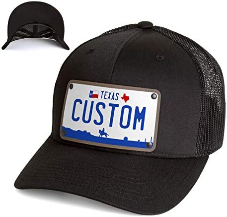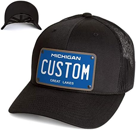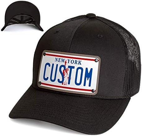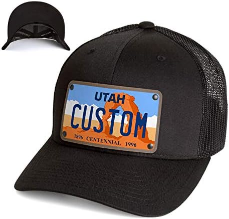 Custom License Plate Snapback Trucker Hat Printed on Leather Patch. Curved Bill.