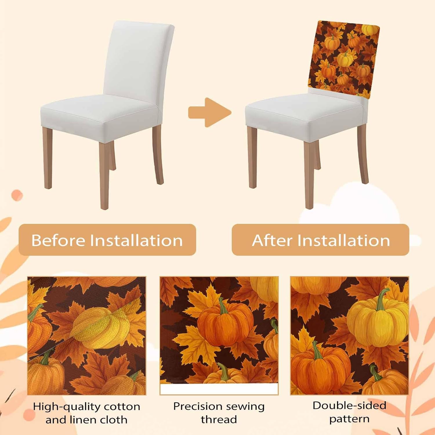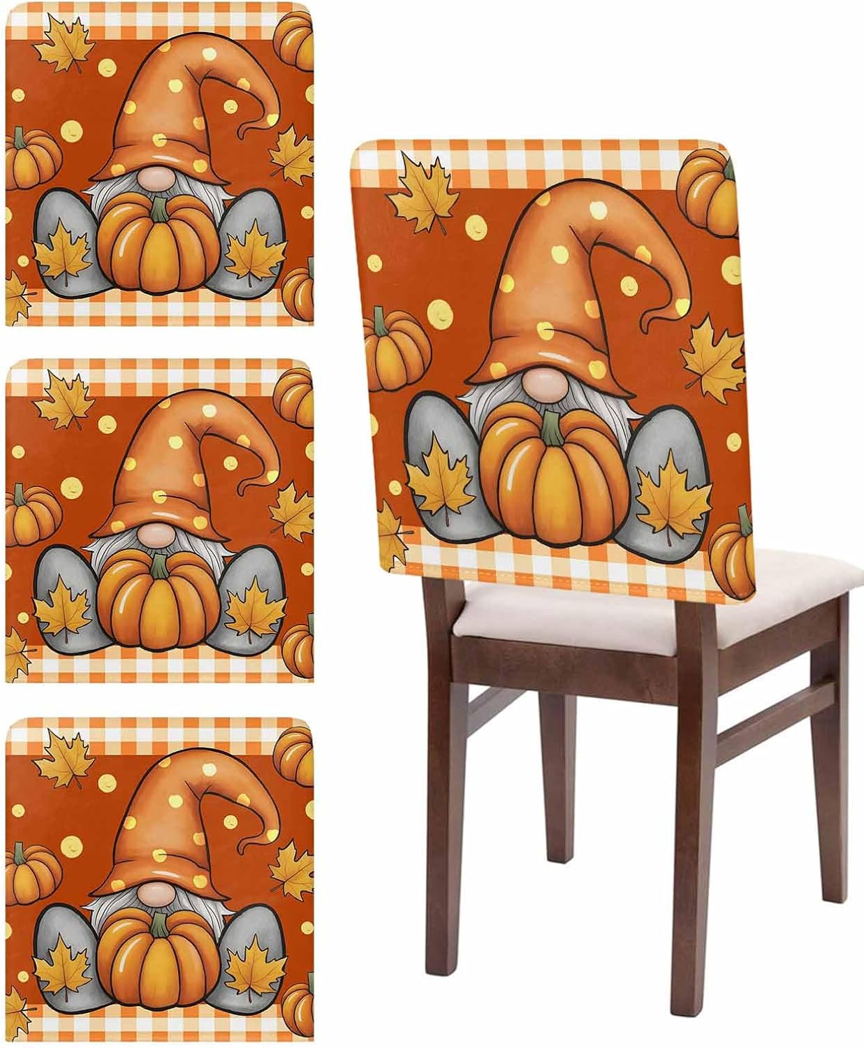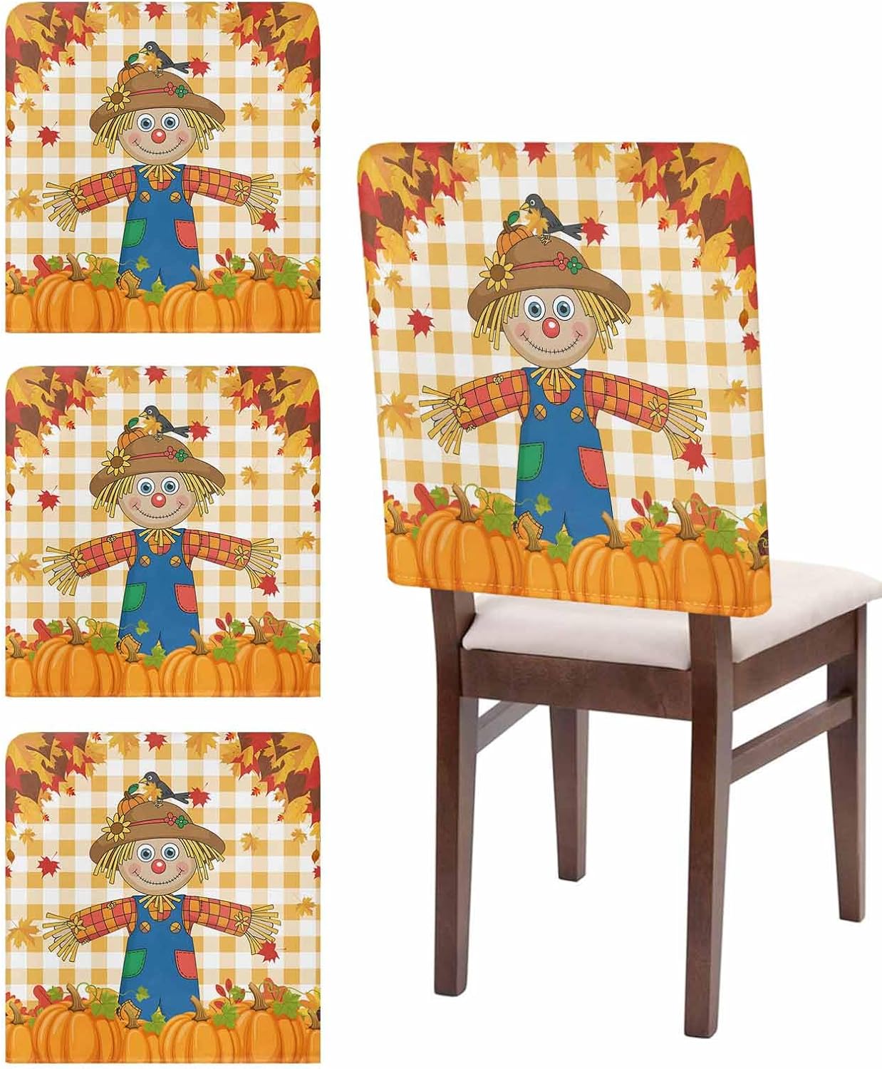 Fall Thanksgiving Pumpkin Chair Back Covers Set Make Your Old Chair a New LookProduct DescriptionCouch Cushion Covers Size Dimensions:Size:20x19 InchSuitable size fits almost all kinds of chairsPackage Includes: 1/4/6/8 PackStretch FabricChair back cover is made of elastic polyester linen fabric. Soft and comfortable, breathable, reusable.More Scene UsesStretch chair back slipcovers are not only functional to protect your furniture from daily dirty but also transform an old, worn-out slipcover into the stunning centerpiece of your room.Highly stretchy and craftsmanship make these dining chair covers perfect fit for most sizes, practical and aesthetic for your room decor.Vibrant PatternOur back chair protector comes in a variety of vibrant colors and patterns for each season and occasion. Give your space a real personality, the perfect gift for various holidays.Easy to CareMachine washing in cold, do not bleach, tumble dry low and low iron if needed.Special NotePlease check the size before purchasing, it is recommended that you measure the back of the chair first.The colors may have slight differences due to different screens.Please allow 0.5" due to manual measurement and stretch fabric.