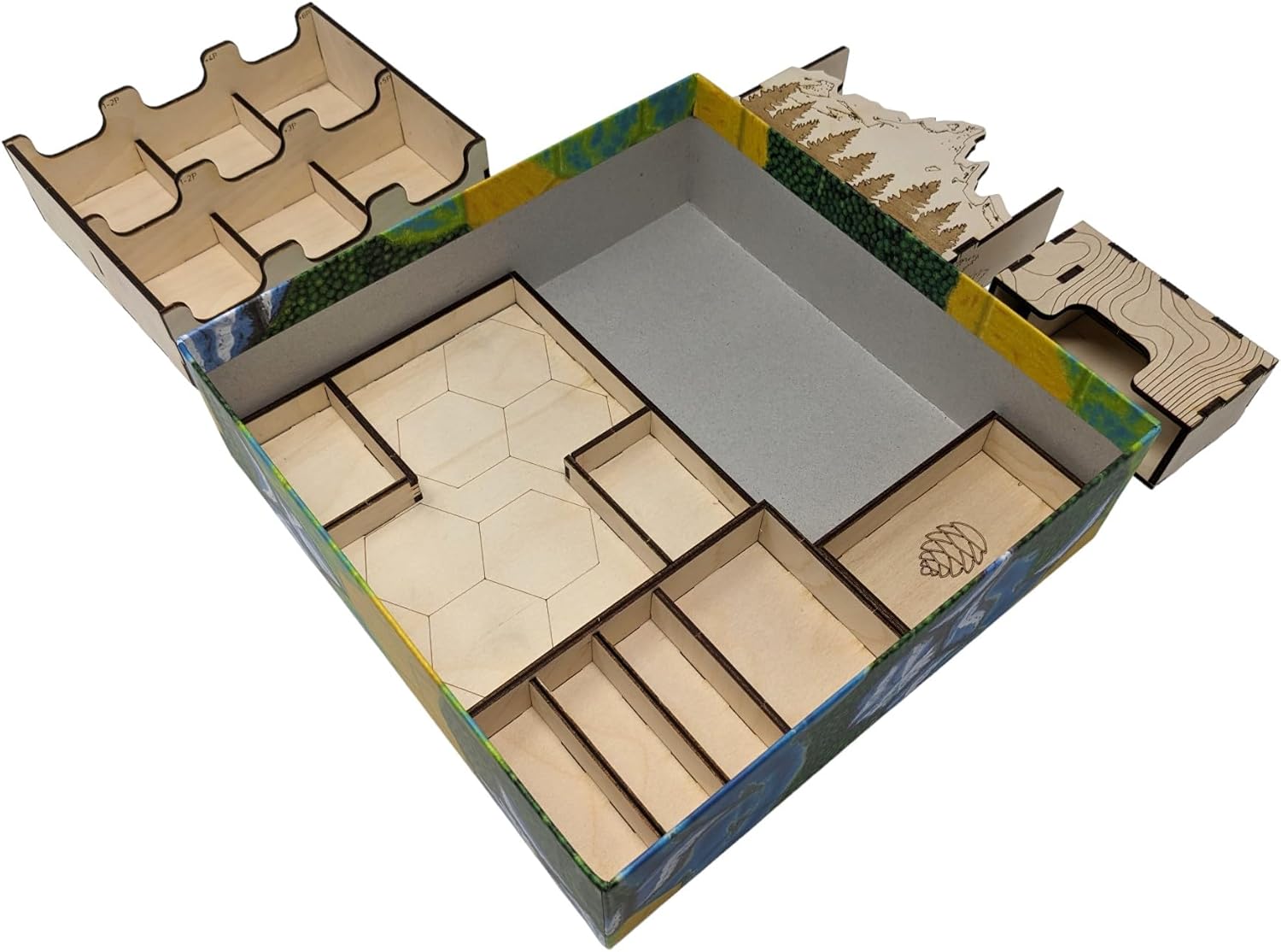 Introducing the perfect storage solution for your Cascadia board game and its expansion, Landmarks. Designed with meticulous attention to detail, this organizer is tailored specifically for Cascadia enthusiasts seeking a sleek and efficient storage solution. Each component is precision-cut to ensure a snug fit for all game components. Whether you're organizing tiles, tokens, cards, or pieces, this organizer provides designated slots for effortless organization and easy access during gameplay. Constructed from durable Baltic Birch Plywood, this organizer offers both durability and an aesthetic appeal. The natural wood grain finish enhances the organizer's visual allure, adding a touch of sophistication to your gaming experience. Features: Precision-cut components for Cascadia and Landmarks. Durable Baltic Birch Plywood construction. Natural wood grain finish for an elegant look. Effortless assembly with included instructions. Space for premium card sleeves. Snug fit allowing the box lid to close fully and allowing for vertical storage of the game.