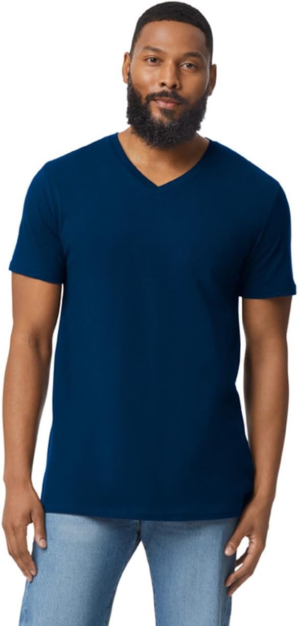 100% cotton jersey 4.5-oz. deluxe 30s Softstyle yarns non-top stitched3/4 rib-knit collar taped neck and shouldersMitered V-neck pattern Euro-style fit on neckShoulders and sleeves double-needle sleeve and bottom hemsQuarter turned to eliminate center creaseSizes: S; M; L; XL; 2XL; 3XL