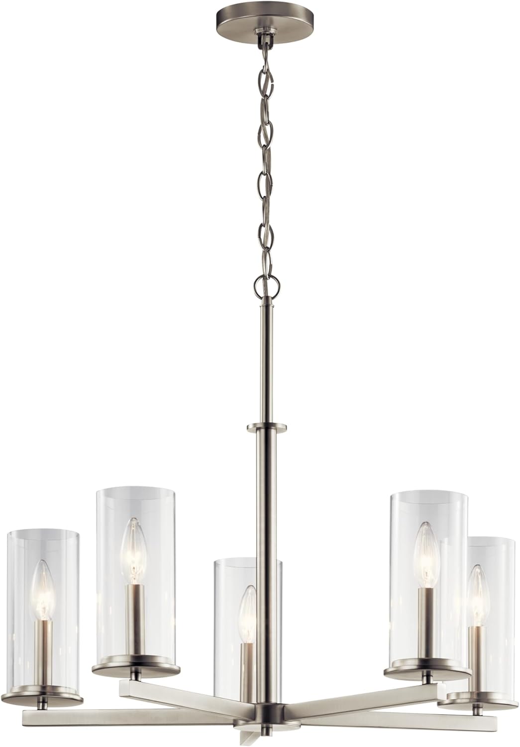 About the Crosby 5-Light Chandelier: Get a taste of versatility at its finest with the simple look and feel of the Crosby 5-light chandelier. Crosby's streamlined design with clean lines and modest form make it the ideal addition to soft modern environments. Its clear glass shades are removable for ease of cleaning, provide ambient lighting to the entire room, and easily incorporate with minimalistic decor.