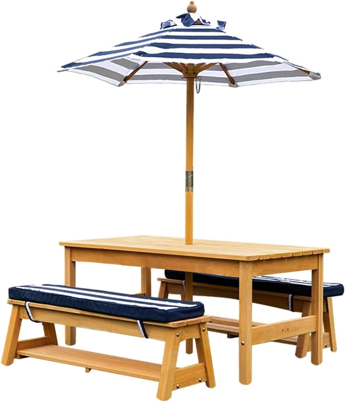 LLZJDDPLY Kids picnic table with umbrellaEnjoy an outdoor picnic with your children in your spare time and feel the warmth and beauty of natureSpecifications:Material: Chinese firColor:Blue , Red , Sky blue , GreenSize: Table size (L 107 x W 58 x H 48 cm / L 42 x W 23 x H 19 in)80kg/176 lbsBench size (L 91 x W 29 x H 27 cm / L 36 x W 11 x H 10 in)150 kg/330 lbsPackage Includes:1 x Table2 x Bench1 x Parasols2 x Butt pad