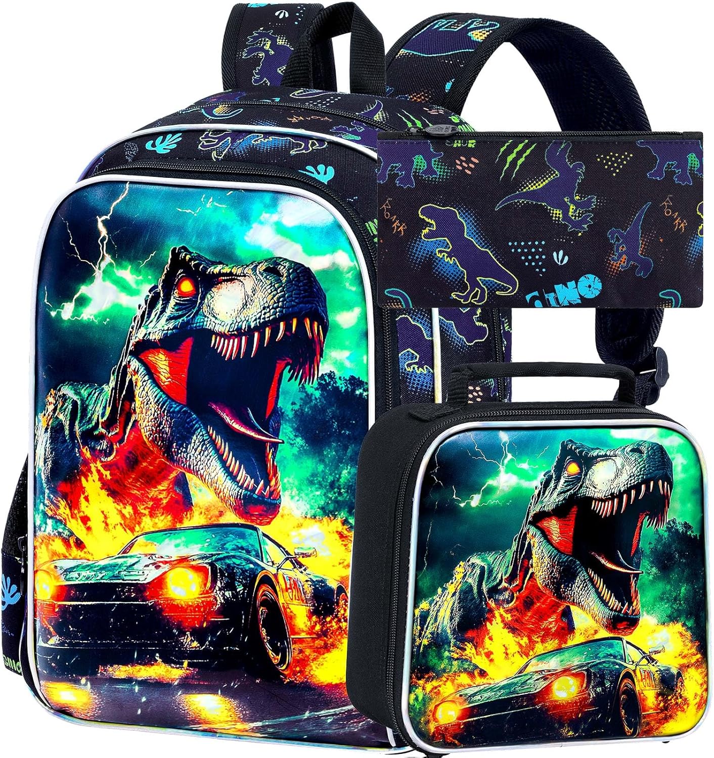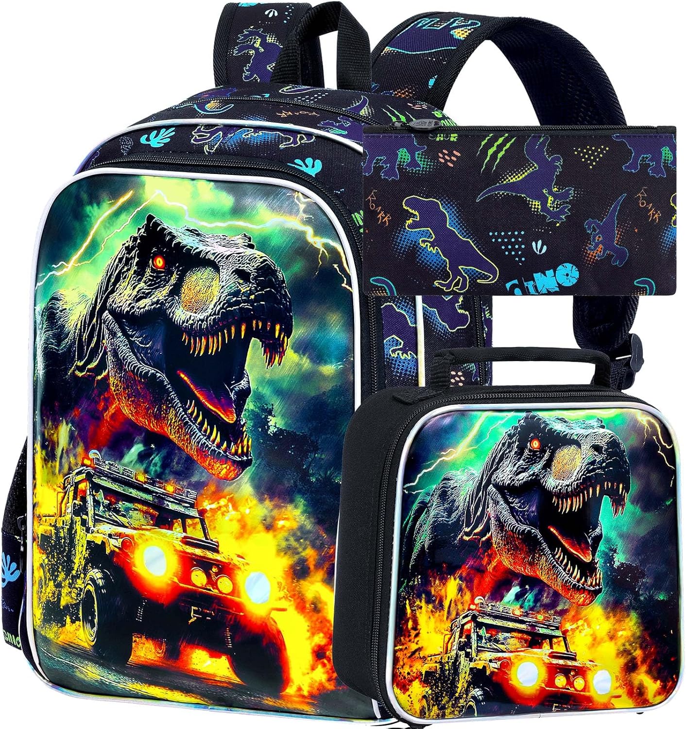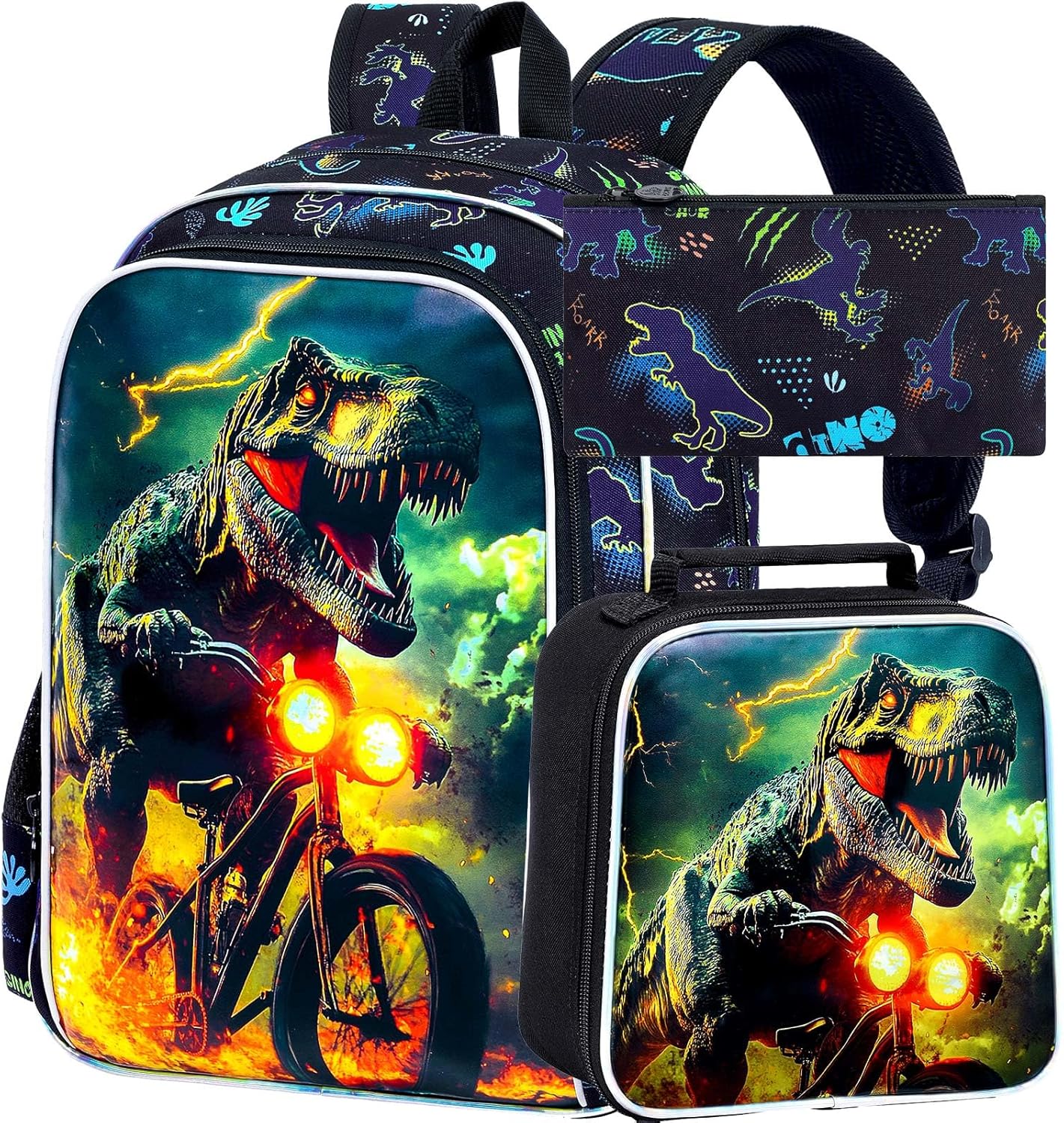 3PCS Dinosaur Preschool Backpack Set, Water Resistant 16" Bookbag for Boys with Lunch Box - Motorcycle Dinosaur