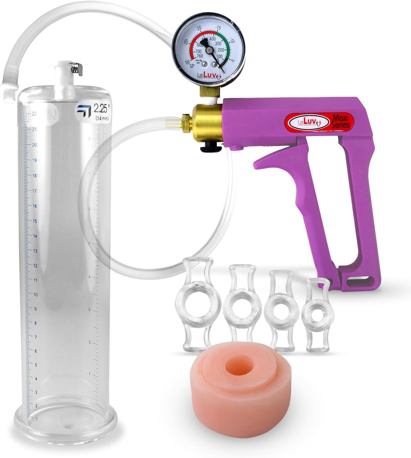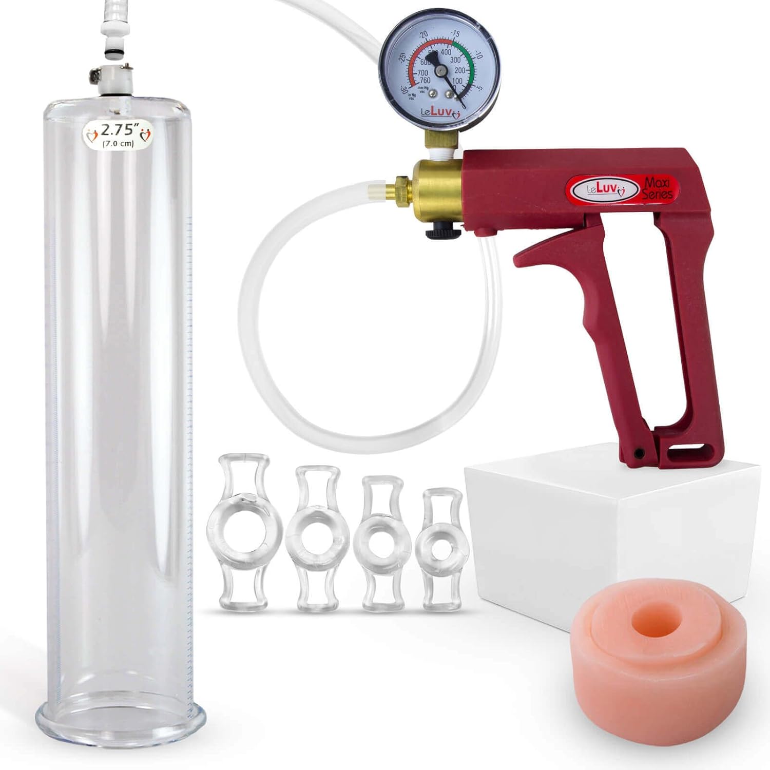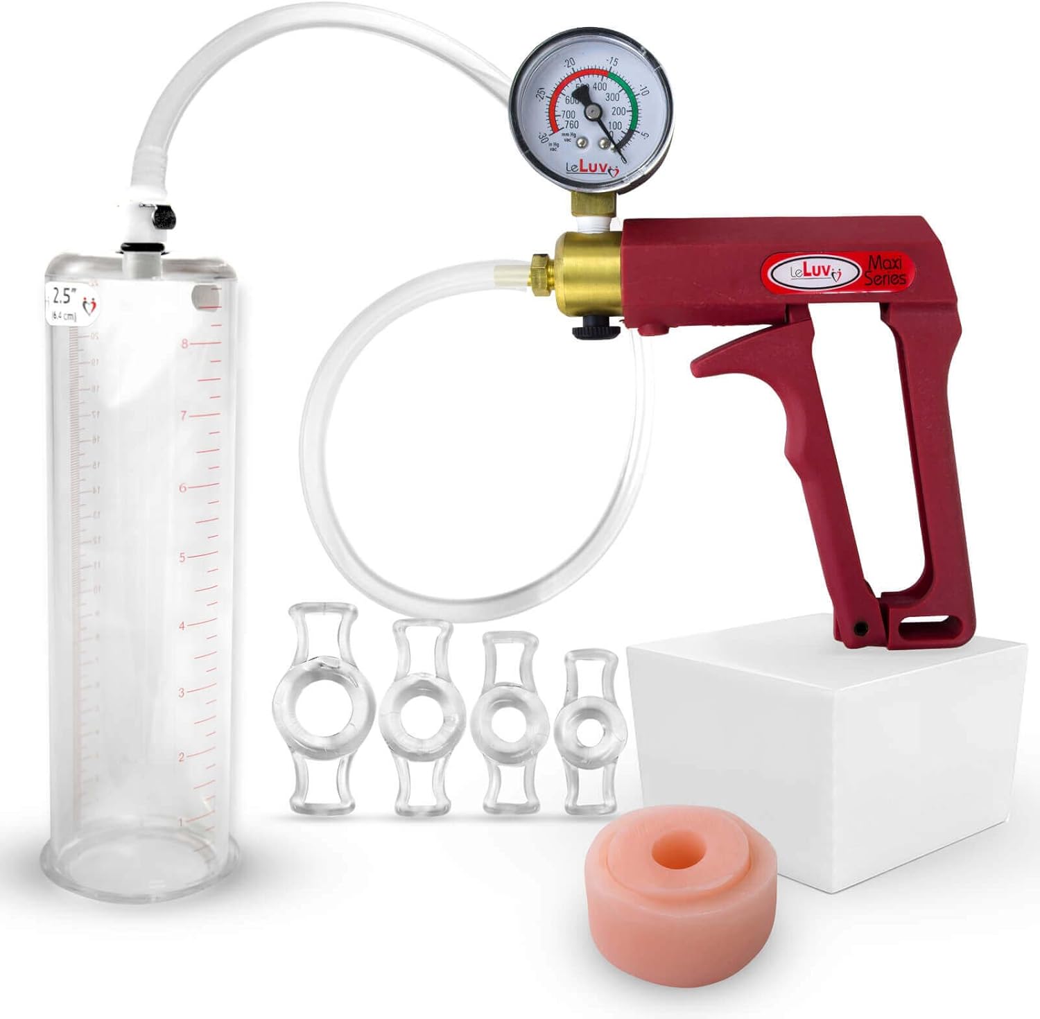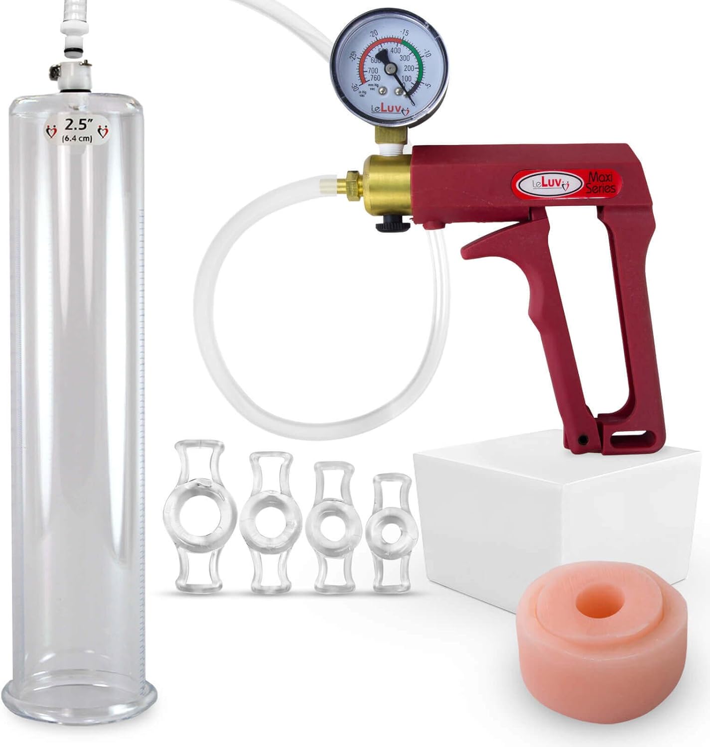Bundle of 3 items: LeLuv Maxi Penis Vacuum Pump with Blue Handle, Soft Silicone Donut Seal & 4 Sizes of Constriction Rings. The LeLuv Maxi penis pump creates an immediate, powerful suction, while the ergonomically designed nylon handle is lightweight and easily used one-handed. It's safety vacuum release valve is easy to operate. We include 18 inches of kink-resistant hose, and our specially-designed Quick-Disconnect Fittings to offer trouble-free pumping sessions. You can even disconnect the hose from the cylinder and it will maintain vacuum! Specially designed to be used with or without any sleeve, the extra-thick clear, seamless, untapered cylinder is graduated in both inches and centimeters up the side. For beginners, it is important to start the pumping process slowly to avoid discomfort. Remember to use the quick release valve if the vacuum becomes too severe. Continue pumping/releasing air until you've found a suitable level of vacuum. The penis should look swollen but should not hurt. Keep an appropriate amount of vacuum on your penis and wait 20 minutes. Once the session is complete, clean the cylinder and any accessory with warm water or arcrylic/silicone-safe cleaner. Let dry before storing.