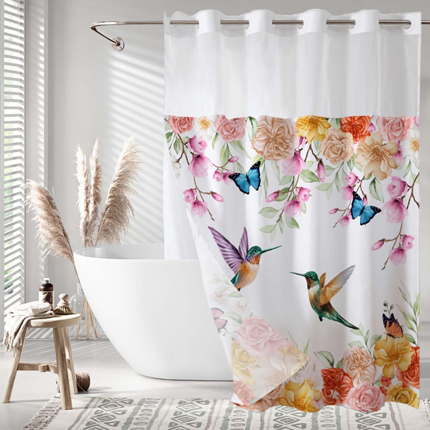 Upgrade your bathroom decor with this luxurious no-hook shower curtain; Designed with convenience in mind, it features ""Split Rings"" that eliminate the need for hooks, making hanging a breeze. The curtain measures 71""W x 74""H inches(181X188cm) and fits standard-sized bathrooms perfectly. It comes with a snap-in fabric liner that measures 70""W x 54""H inches (176X136cm).The built-in white fabric liner can be easily removed for cleaning or replacement, ensuring hassle-free maintenance.; The mesh sheer window at the top allows natural light to enter the shower, creating a bright and inviting atmosphere. Additionally,the two magnets at the bottom ensure the curtain stays securely attached to the bathtub, providing privacy during your shower.Crafted with high-quality fabric, this shower curtain and liner set is both durable and water repellent. It can be easily cleaned by either machine or hand washing, allowing you to maintain its pristine condition effortlessly. Please notethat it's important to separate the shower curtain from the inner liner before washing.Enhance your bathroom with this exquisite 3D printing pattern no-hook shower curtain and enjoy a stylish and functional addition to your space.