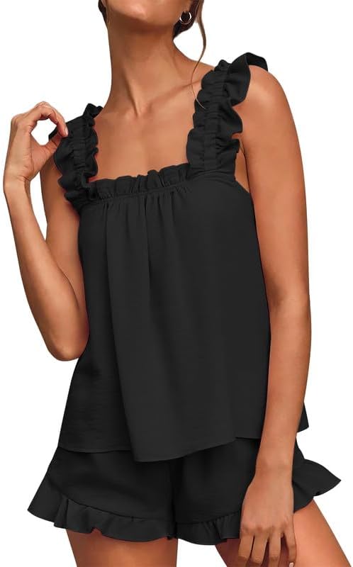 • Classy Design: Our Women's pj sets feature a sleeveless top with cascading ruffles, perfectly complemented by cozy elastic drawstring shorts with delicate side ruffle detail (no pockets) for a delightful bedtime ensemble.