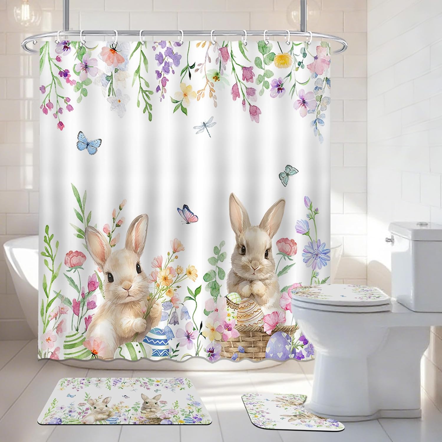 Sizes:Waterproof Shower Curtain Size: 70.8"Lx70.8"W, Non-Slip Bathroom Mat Size: 29.5"LX 17.7"W, U-Shaped Rug Size: 17.7"LX 14.8" W, Toilet Lid Cover Size: 17.7"LX13.8"W. This Easter shower curtain set can fit most home bathrooms.