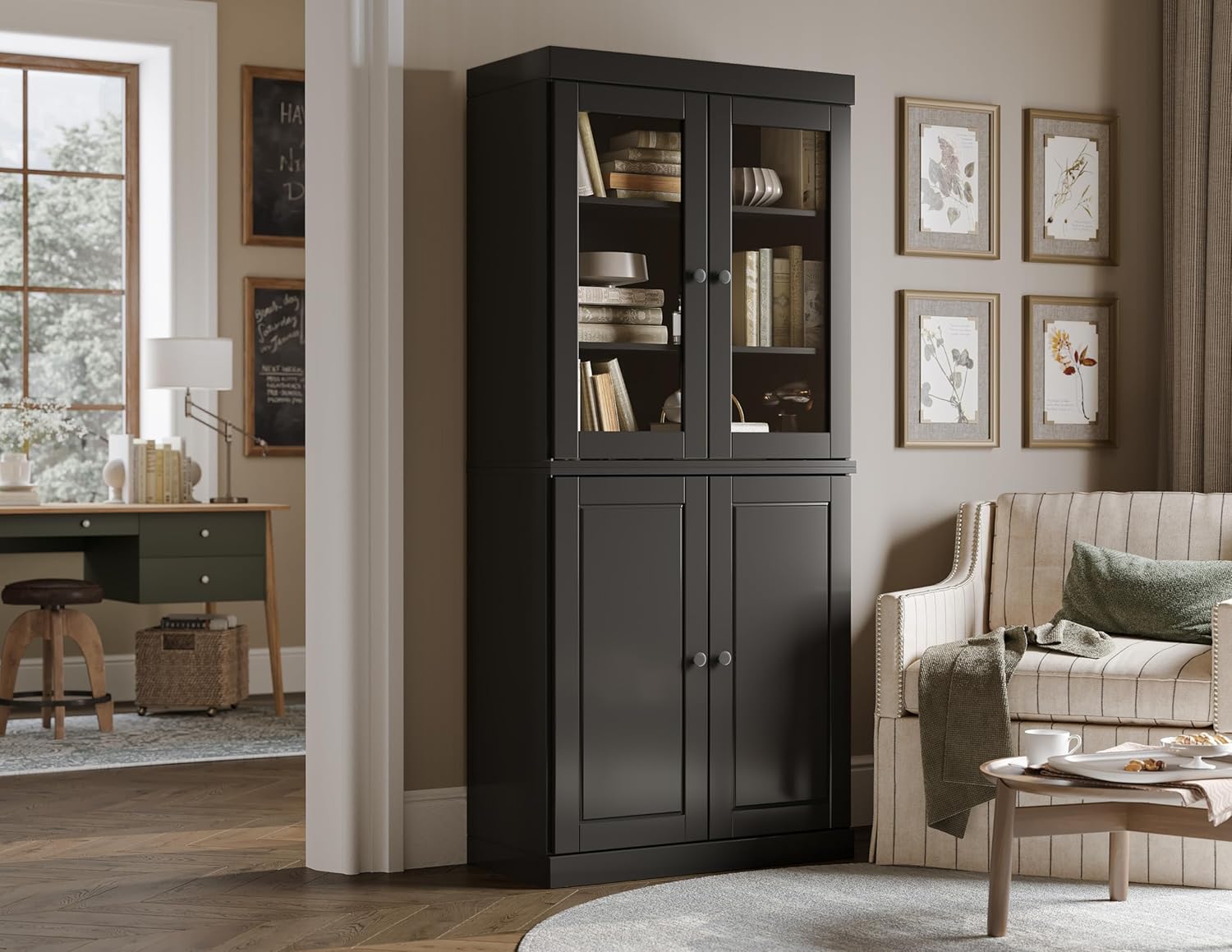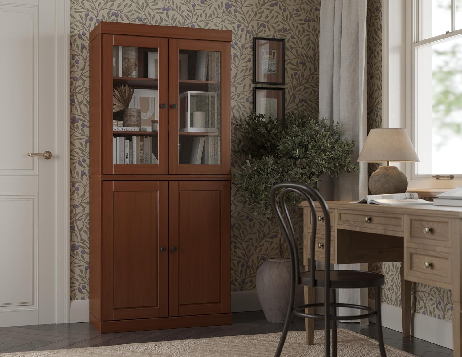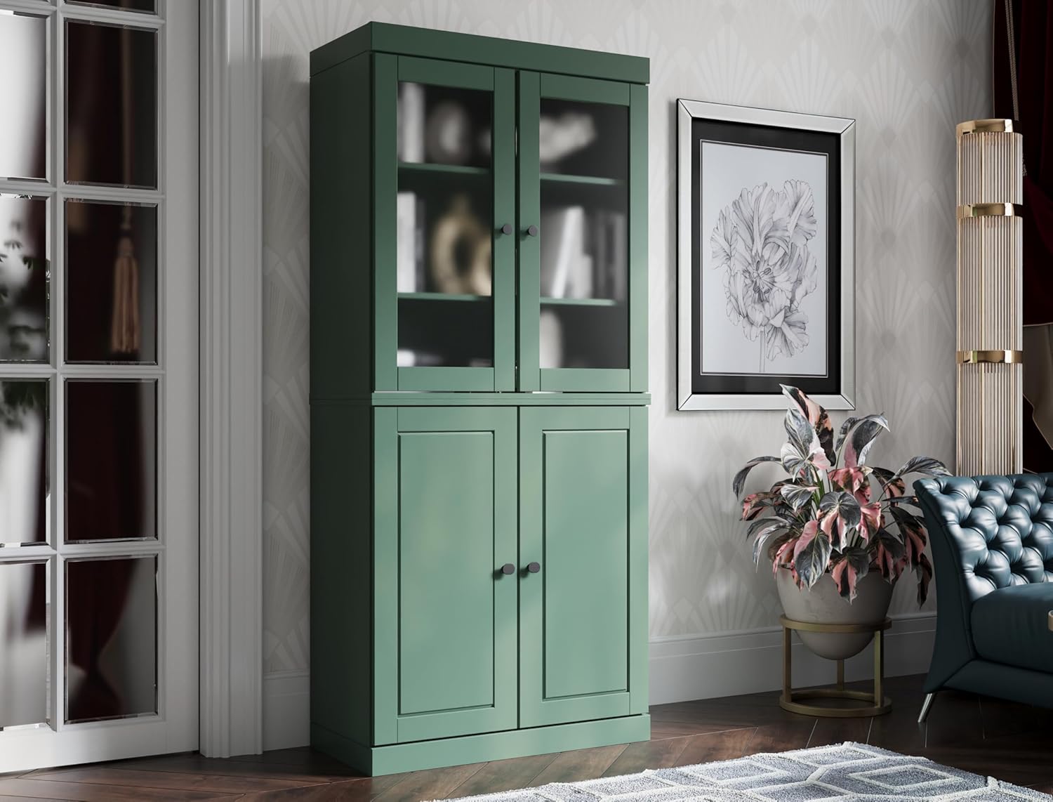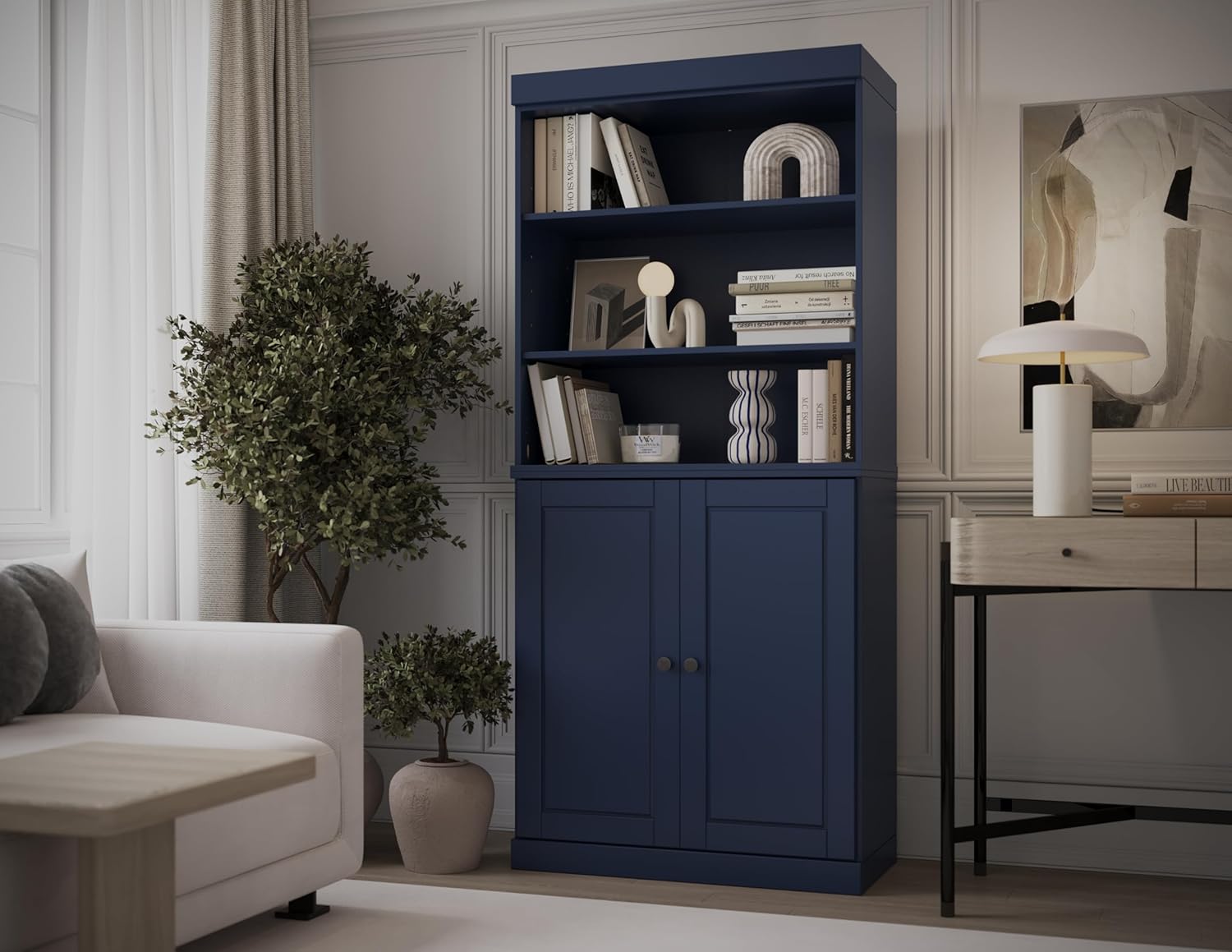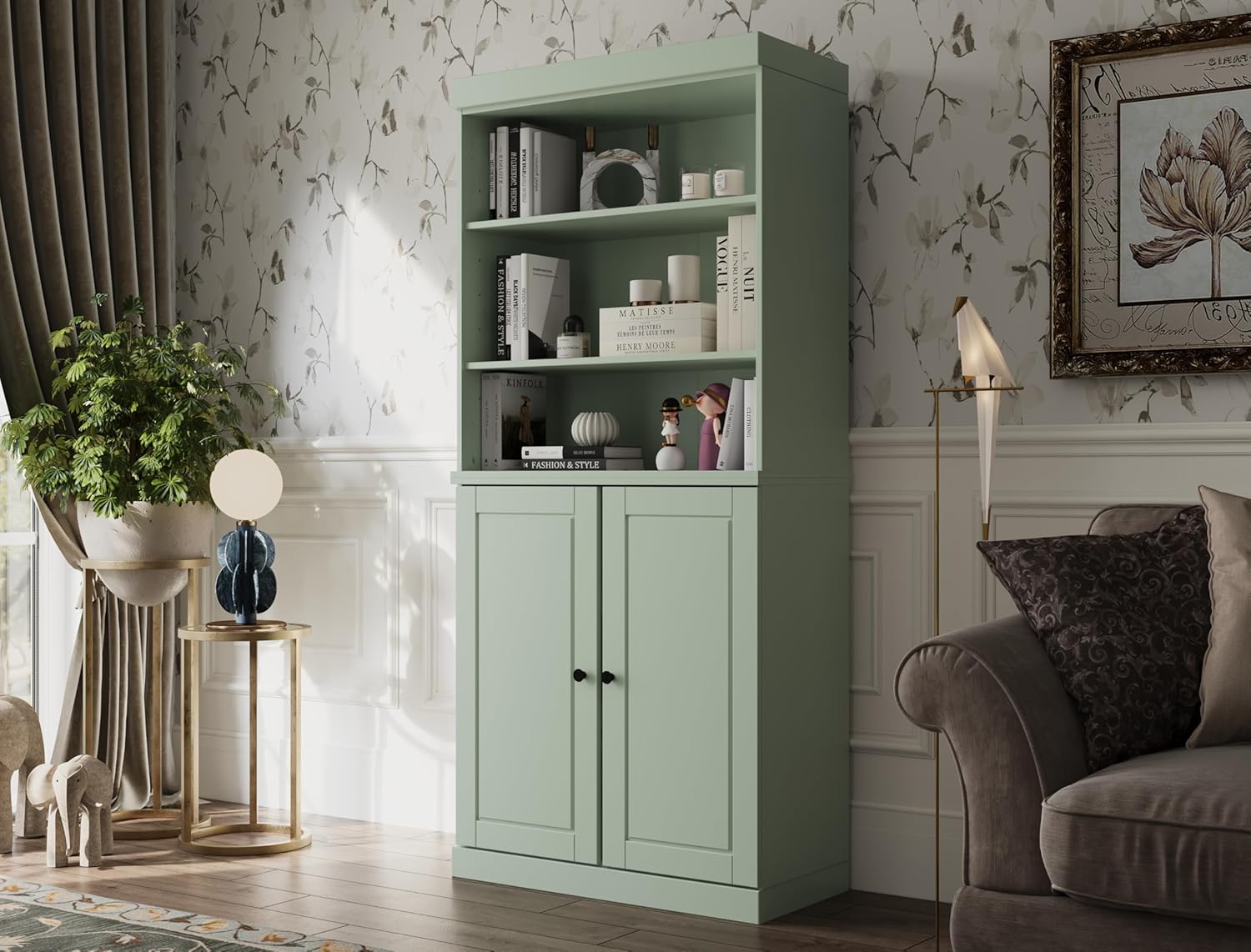 • Overall Size, Color & Design: 71.5"H x 32"W x 15.5"D – Our tall aqua bookcase features open top & 2 bottom full wood panel doors for a classic, seamless look that keeps contents hidden. Constructed from 100% solid pine with a refined wood veneer finish. Includes a 4mm (5/32") painted plywood back panel for a clean interior. Anti-tip hardware included for secure wall mounting. Assembly required; all components and instructions included