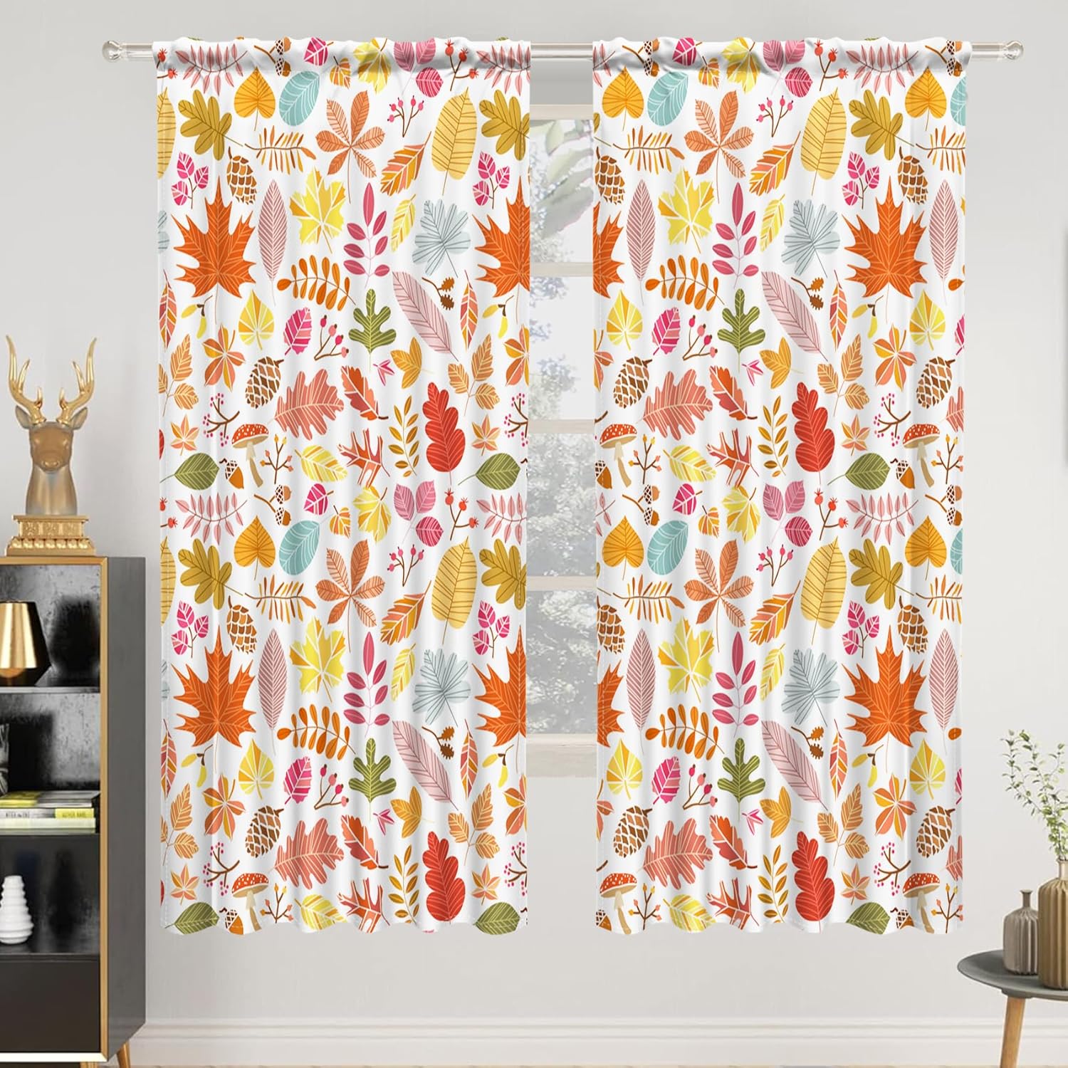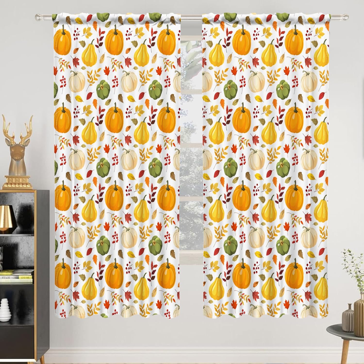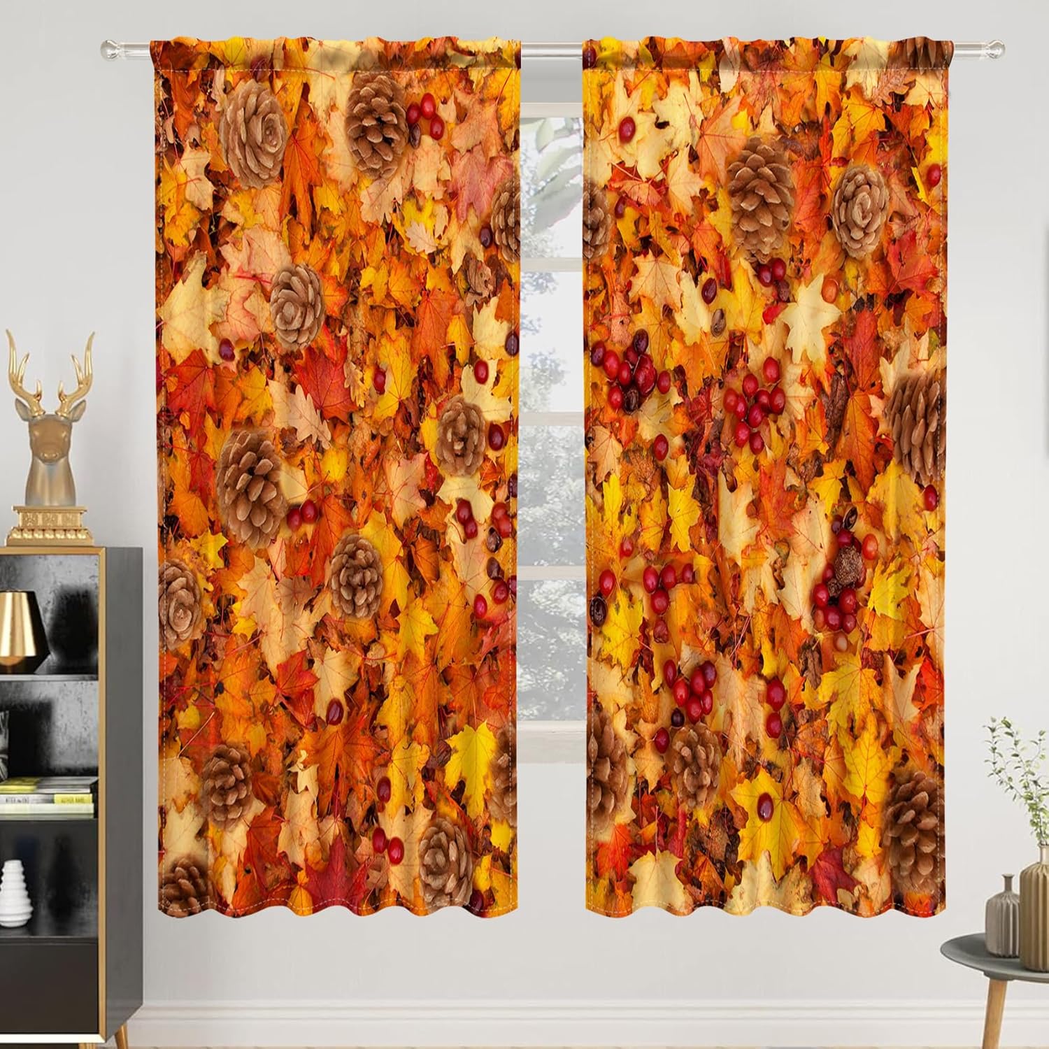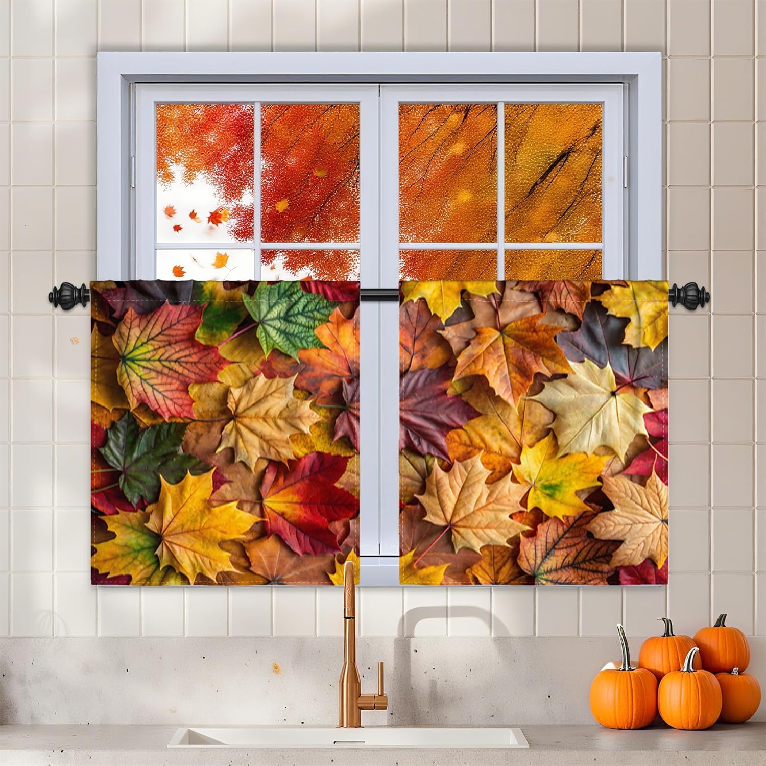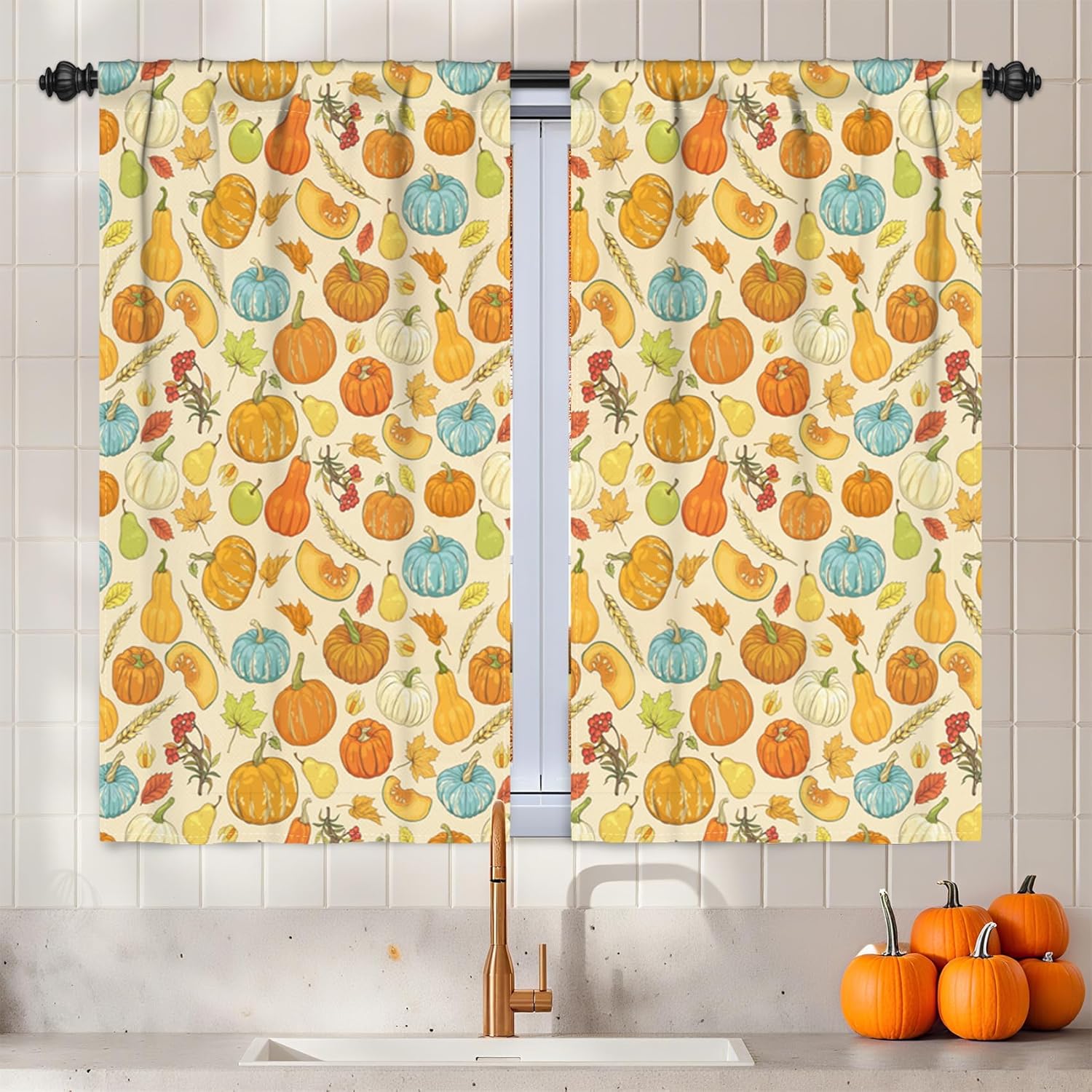 Renaiss 42 x 45 Inch Fall Pumpkin Kitchen Curtains Maple Leaf Print Linen Textured Small Cafe Curtains Autumn Pumpkin Window Treatment Light Filtering Short Curtain for Bathroom Basement 2 Panels
