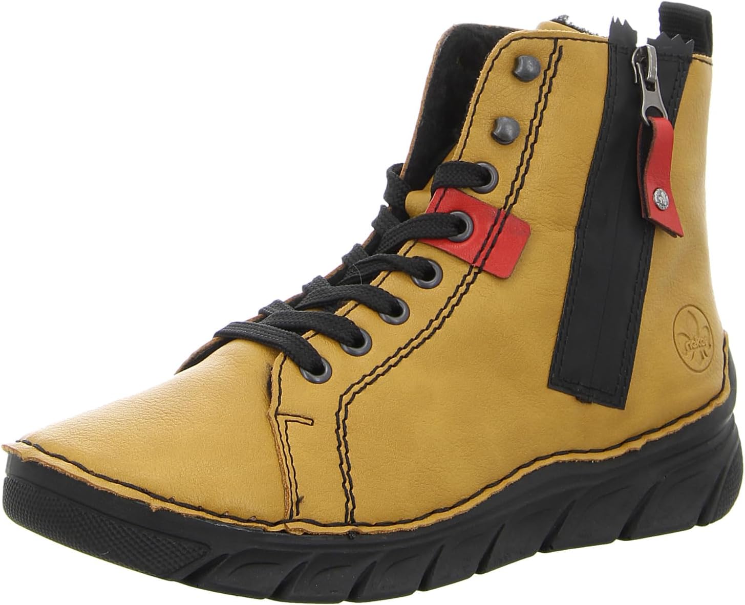 Comfort meets Style. These yellow-black Rieker lace-up boots not only look super trendy, they also protect your feet from the minus temperatures. The stitching design makes this shoe a particularly durable and flexible companion. In addition to the lacing, the model is also equipped with a zip and thus ensures a good grip. The shock-absorbing and very light sole ensures a comfortable walking feeling even during long periods of wear and the extra soft insole is another plus. With the soft warm lining, the shoes are well equipped for cold temperatures. You can't want anything more!