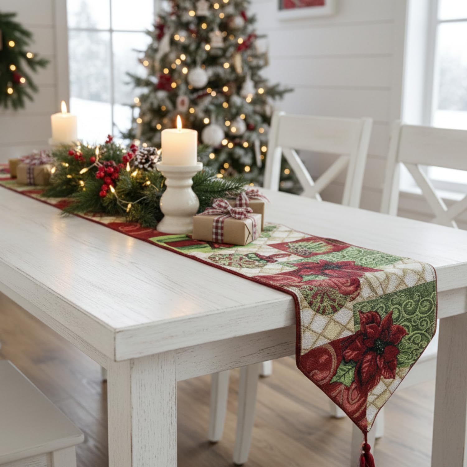 Style/Use: Use this traditional vintage festive holiday runner as a decorative piece to liven up your home. It is the perfect finishing touch for your living or dining room décor. These bright and festive table linens will fill your home with the holiday spirit.