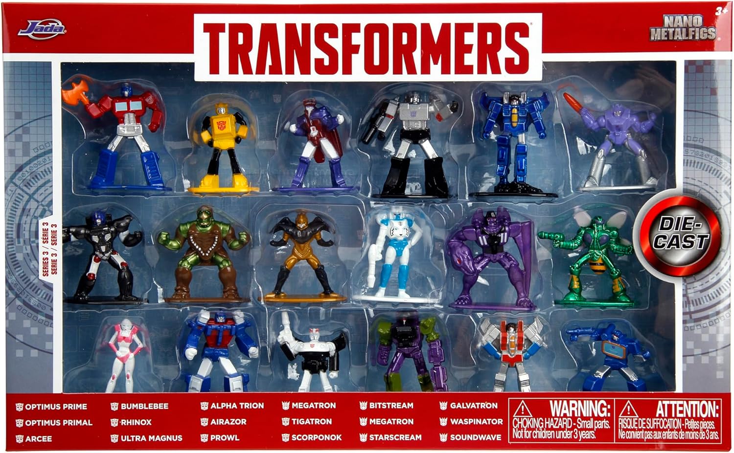 Autobots, roll out! Your favorite Transformers heroes and villains make their debut in this Transformers Nano Metalfigs 18-pack. Crafted from durable materials such as 100% die - cast metal and premium metallic paints, the quality of these figures is undeniable. Standing at about 1.65" and weighing approximately 30g, our high - end casting method allows us to capture the styling, posing, and unique qualities to various Transformers characters. These die-cast figures are suitable for children as young as 3 years of age.
