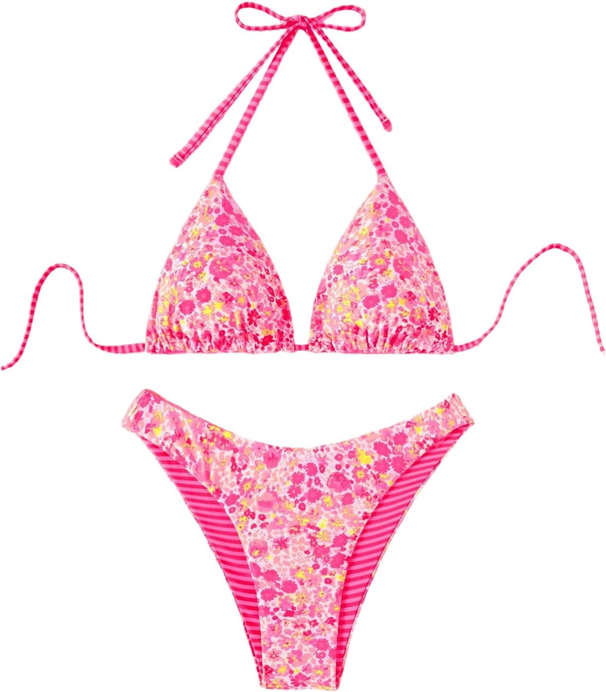 • Features: Two piece bathing suits for women, floral print, striped, tie backless halter string triangle bikini top, high cut bikini bottoms