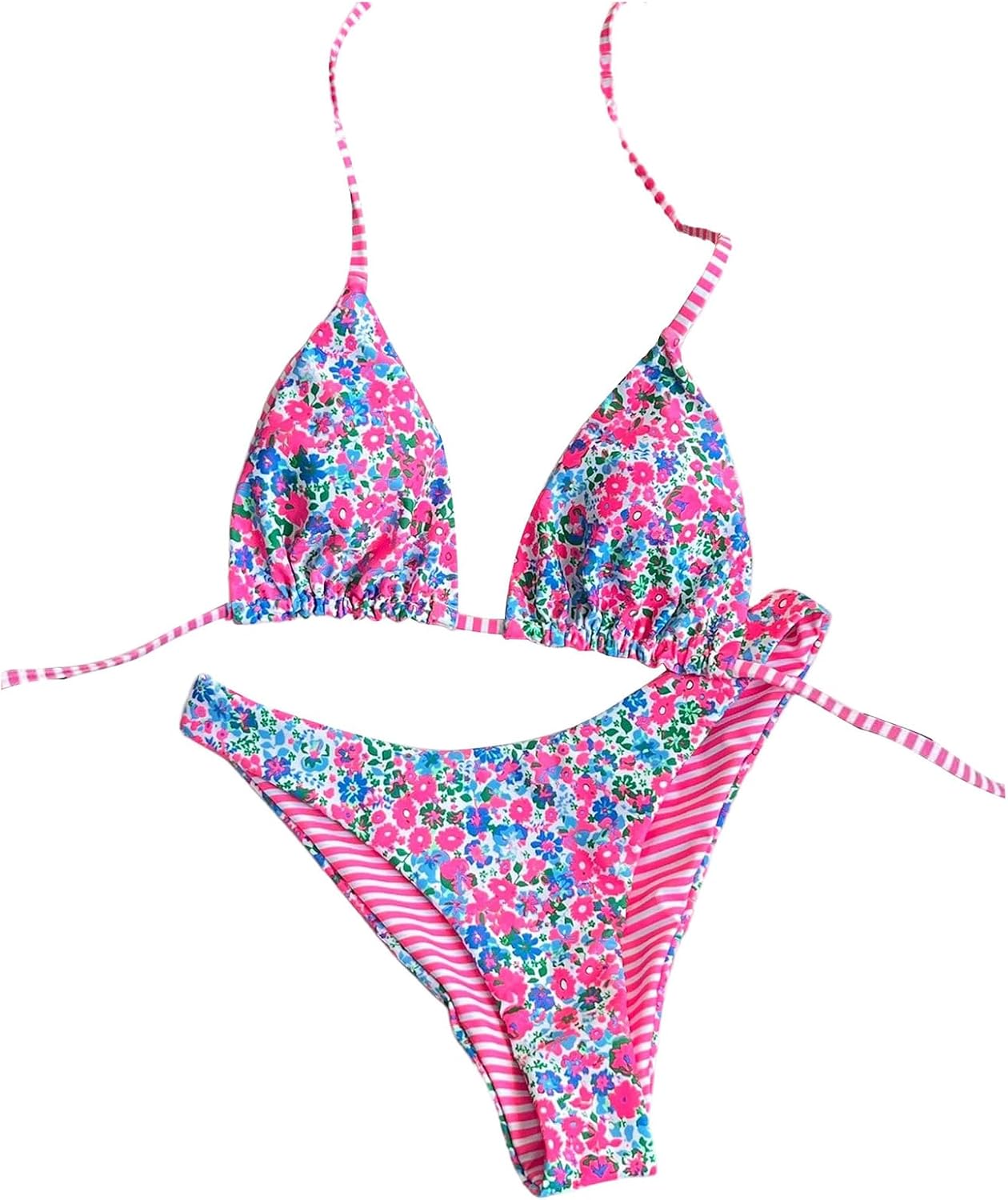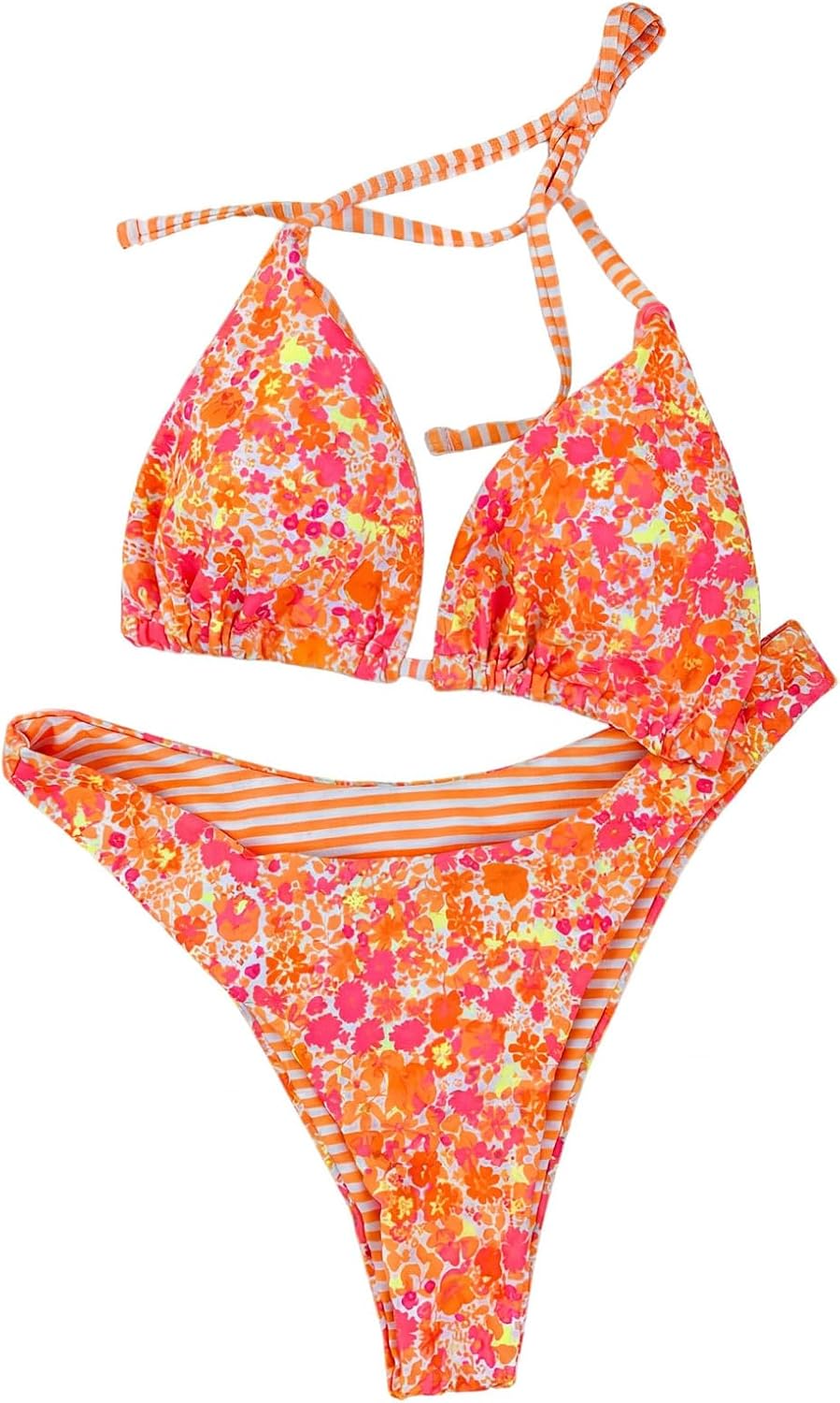 WDIRARA Women's 2 Piece Floral Striped Bikini Set Halter String Thong Swimsuit High Cut Bathing Suit