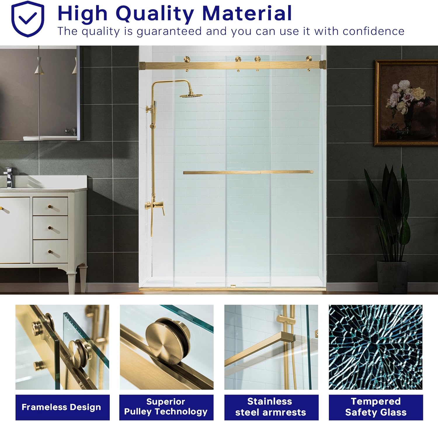 WOODBRIDGE Frameless Shower Doors 56-60" Width x 66"Height with 5/16"(8mm) Clear Tempered Glass, 2 Ways Opening & Double Sliding in Brushed Gold Finish